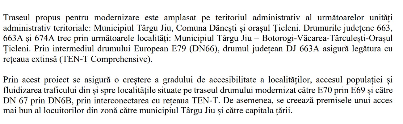 Consilierii județeni vor aproba în ședința din 26 ianuarie proiectul privind „Modernizare infrastructură rutieră de interes județean pe drumul județean 663A ce traversează localitățile Târgu Jiu (DN 66) – Botorogi – Văcarea – Țîrculești (DJ 674A) – intersecție cu DJ 663 și drum județean 674A ce traversează localitățile Țîrculești (DJ 663A) – Țicleni (DJ 675)”, în vederea finanțării acestuia în cadrul Programului Regional Sud-Vest 2021-2027”.