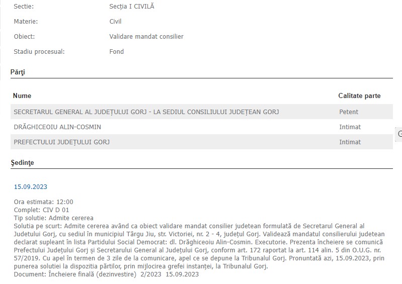 „Admite cererea având ca obiect validare mandat consilier județean formulată de Secretarul General al Județului Gorj, cu sediul în municipiul Târgu Jiu, str. Victoriei, nr. 2 – 4, judeţul Gorj. Validează mandatul consilierului județean declarat supleant în lista Partidului Social Democrat: dl. Drăghiceoiu Alin-Cosmin. Executorie. Prezenta încheiere se comunică Prefectului Judeţului Gorj şi Secretarului General al Judeţului Gorj, conform art. 172 raportat la art. 114 alin. 5 din O.U.G. nr. 57/2019. Cu apel în termen de 3 zile de la comunicare, apel ce se depune la Tribunalul Gorj”, este decizia pronunțată pe 15 septembrie de Tribunalul Gorj.