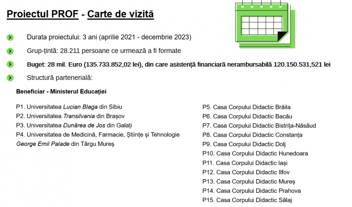 Potrivit ME, proiectul PROF urmărește intervenția integrată la nivelul sistemului de învățământ, care să reunească învățământul universitar (formarea inițială a profesorilor) și învățământul preuniversitar (asigurarea unei educații de calitate pentru elevi), printr-o formare continuă adecvată și eficientă a profesorilor. Proiectul are un buget de 28 mil. de Euro și o durată de trei ani (aprilie 2021 – decembrie 2023), urmând a fi formate 28.211 persoane.
