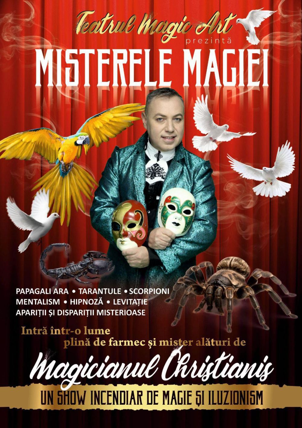 ”Misterele magiei – este unul dintre cele mai apreciate spectacole de magie pentru copii și adulți din România. Spectacolul de la Târgu Jiu, susținut de Magicianul Christianis, vă v-a introduce într-o lume fantastică care surprinde prin apariții și dispariții misterioase, iluzii comice și multiplicări, o feerie magică ce va încânta prin eleganță și rafinament, un spectacol incendiar cu tarantule, scorpioni, porumbei și papagali Ara. Intră într-o lume plină de farmec și mister alături de magicianul Christianis, descoperă tainele magiei într-un show unde imposibilul devine posibil, un spectacol interactiv pentru toate vârstele”, au transmis organizatorii.
