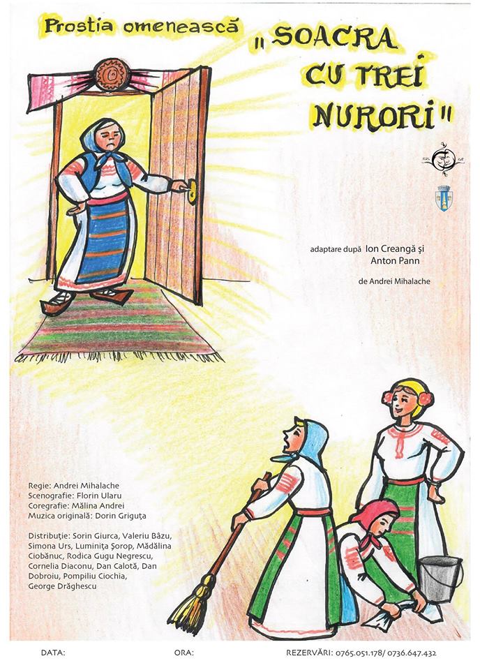 Duminică, 17 martie, la orele prânzului, actorii Teatrului Dramatic ,,Elvira Godeanu” din Târgu-Jiu, vor pune în scenă premiera unei noi piese, dedicate copiilor. Este vorba despre spectacolul ,,Prostia omenească – Soacra cu trei nurori”.