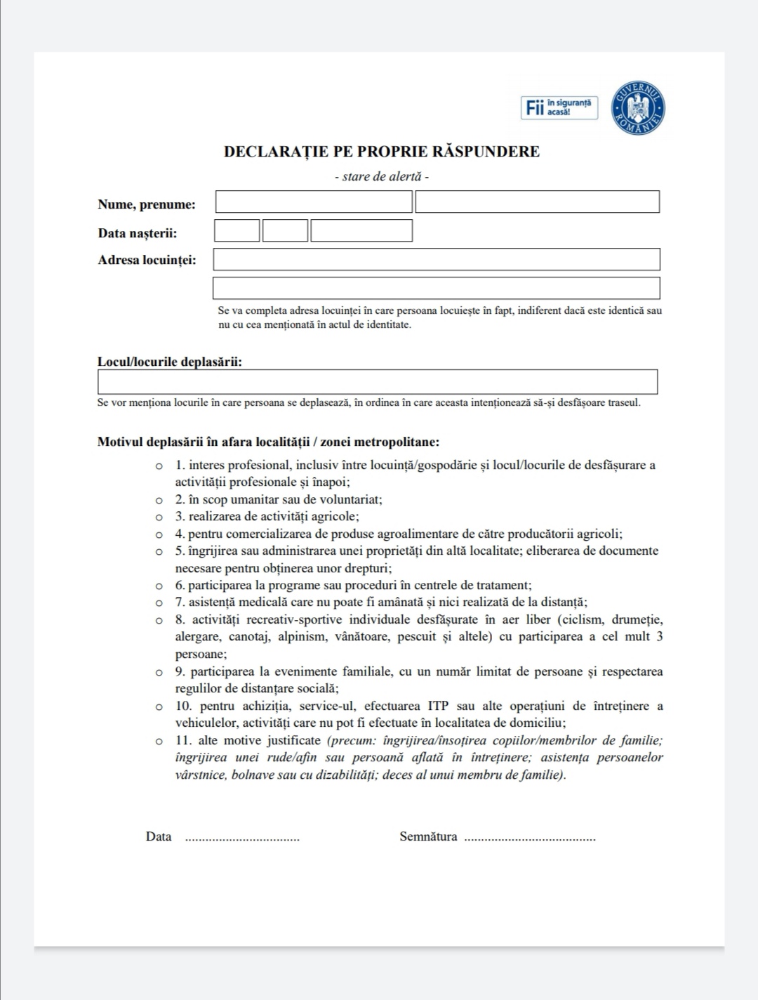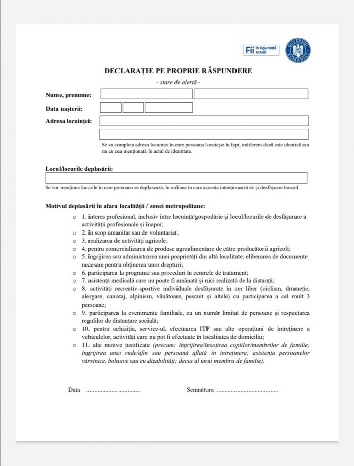 Deplasarea în afara localității va fi permisă doar pentru câteva motive, iar cei ies din localitate trebuie să completeze un nou tip de declarație pe propria răspundere.