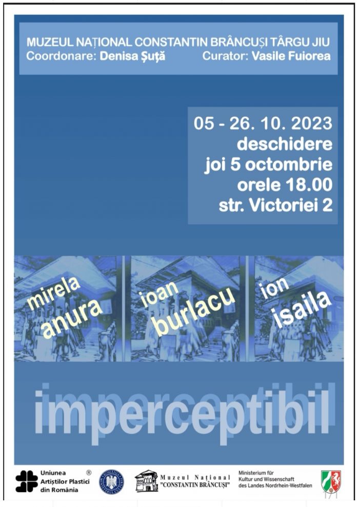 „Vă așteptăm, joi, 5 octombrie, ora 18,00 la vernisajul expoziției ”Imperceptibil” ce cuprinde lucrări semnate de valoroșii artiști: Mirela Anura, Ioan Burlacu și Ion Isaila. Expoziția este curatoriată de conf.univ.dr. Vasile Fuiorea, artist plastic, președintele filialei Târgu Jiu a Uniunii Artiștilor Plastici din România”, a anunțat conducerea Muzeului Național „Constantin Brâncuși” din Târgu Jiu.