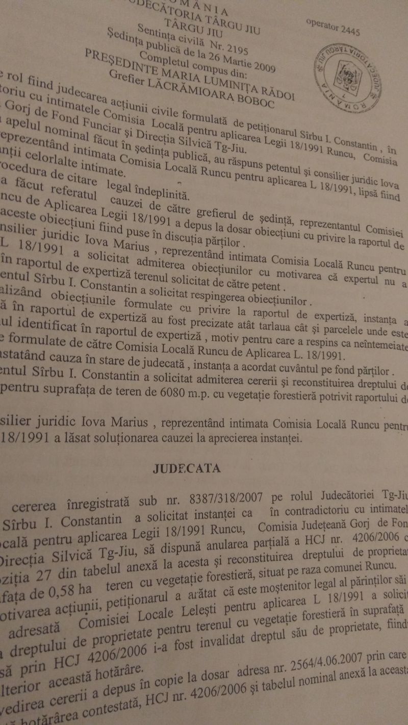Pădurea de 6080 de mp, aparținând lui Constantin Sîrbu, în vârstă de 86 de ani, din comuna Runcu, satul Dobrița, a fost tăiată în rast, în luna februarie, de către pădurarul ocolului silvic din localitate. O spune chiar proprietarul pădurii care s-a trezit, cu două luni în urmă, că pădurea obținută de acesta prin hotărâre judecătorească, în 2009, nu mai există. Pe locul proprietății se mai găsesc doar câteva cioate și acelea acoperite cu pământ, pe proprietate trecându-se cu buldozerul pentru a se face un drum necesar transportatorilor de lemne din zonă. Proprietarul spune că i-a cerut explicații pădurarului Aribășoiu Vasile, care ar fi dat din umeri, apoi a sesizat problema la Direcția Silvică Gorj.