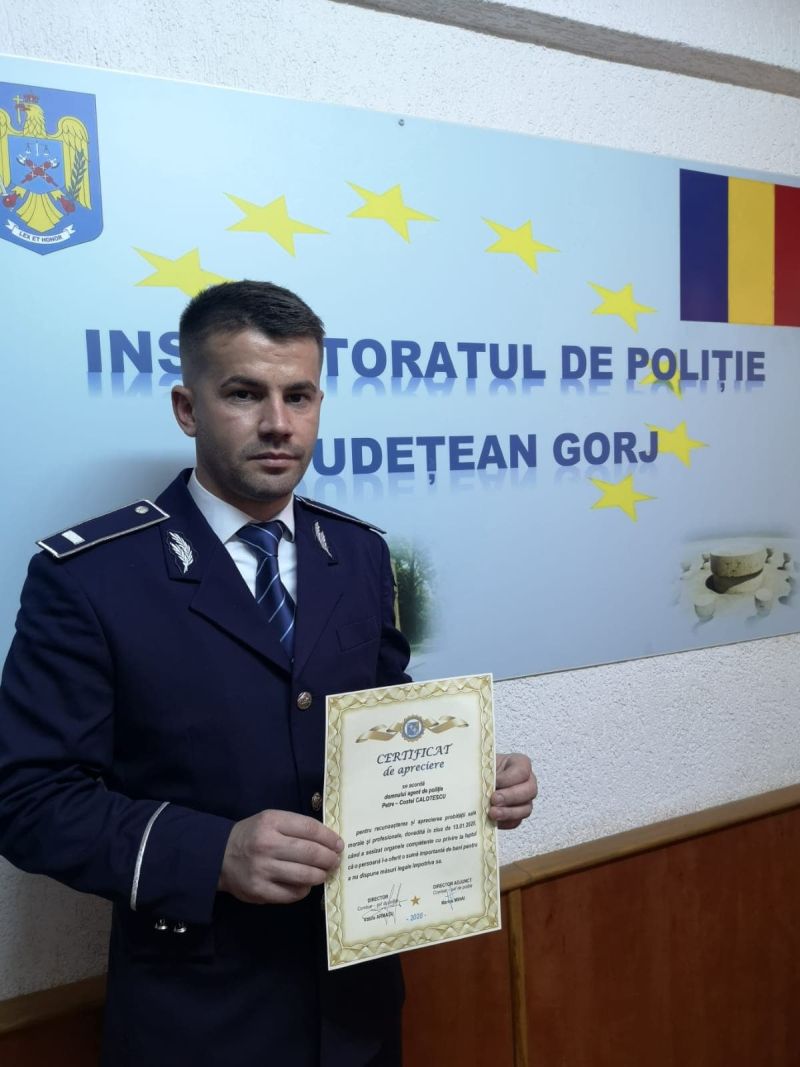 Petre Calotescu, agentul din cadrul Poliției Orașului Novaci, care, pe 13 ianuarie, a denunțat un bărbat care i-a dat mită pentru a-și scăpa de dosar penal nepotul prins beat la volan, a fost recompensat de reprezentanții Poliției Române. ,,A fost recompensat de domnul comisar șef Vasile Armașu, director al Direcției de Ordine Publică – IGPR, cu un certificat de apreciere pentru recunoașterea probității sale morale și profesionale, dovedită în ziua de 13 ianuarie 2020, când a sesizat organele competente, cu privire la faptul că o persoană i-ar fi oferit o sumă de bani, pentru a nu dispune măsurile legale împotriva sa”, a declarat Victor Țuhașu, purtătorul de cuvânt al IGPR. După denunț, bărbatul acuzat că a oferit mită a fost reținut. După o noapte petrecută în arest, procurorul de caz, din cadrul Parchetului de pe lângă Tribunalul Gorj, a decis să fie pus sub control judiciar, în timpul cercetărilor. Potrivit ofițerilor Serviciului Județean Anticorupție Gorj, bărbatul este unchiul șoferului în vârstă de 29 de ani, din orașul Târgu-Cărbunești, care a fost prins, la începutul lunii, de două ori, în timp ce conducea un autoturism sub influența băuturilor alcoolice. Acesta este acuzat că a mers, cu nepotul său, la sediul Poliției Novaci și ar fi oferit 200 de euro unor agenți pentru a-l scăpa de dosar penal pe tânărul de 29 de ani. Unul dintre agenți, Petre Calotescu, a făcut imediat un denunț la Serviciul Județean Anticorupție Gorj. ,,Luni, 13 ianuarie, ofițerii de poliție judiciară ai Direcției Generale Anticorupție – Serviciul Județean Anticorupție Gorj, sub coordonarea procurorului desemnat din cadrul Parchetului de pe lângă Tribunalul Gorj, au prins în flagrant două persoane, unchi și nepot, în timp ce ofereau cu titlu de mită unui agent de poliție suma de 200 euro pentru ca unuia dintre ei, nepotul, să nu-i fie întocmit dosar penal, după ce a fost depistat, în aceeași zi, în două rânduri, pe tronsoane de drum diferite, conducând sub influența băuturilor alcoolice”, se precizează într-un comunicat al Serviciului Județean Anticorupție Gorj. Pe 11 ianuarie, șoferul în vârstă de 29 de ani a fost depistat la volan, pe raza comunei Bengești-Ciocadia, în stare de ebrietate. De supărare că i-a fost suspendat dreptul de a conduce mașina, acesta a plecat din nou la drum. ,,În fapt, sâmbătă, 11 ianuarie 2020, agenții de poliție din cadrul Secției Nr. 9 de Poliție Rurală Novaci, l-au depistat pe bărbat, conducând pe drumurile publice un autoturism, fiind sub influența băuturilor alcoolice, respectiv 0,78 mg/l alcool pur în aerul expirat la ora 04,25 și, 0,57 mg/l alcool pur în aerul expirat la ora 07,21, astfel că i s-au întocmit dosare penale.