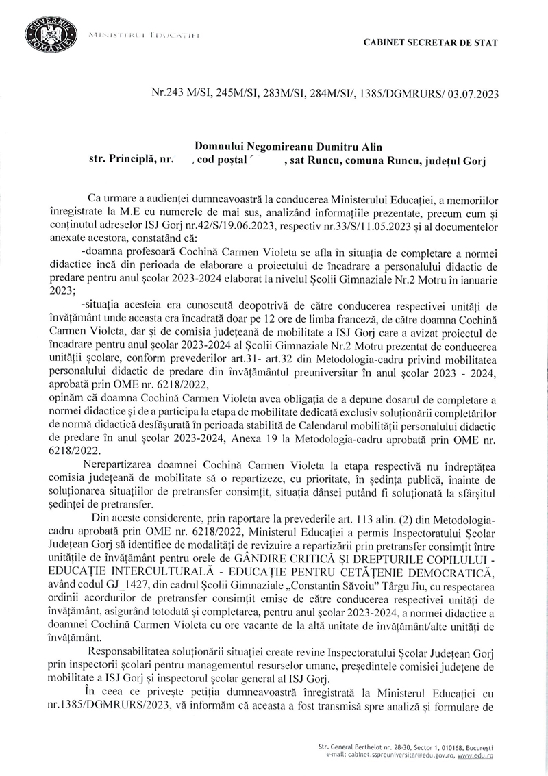 Alin Negomireanu a făcut contestație, atât la ISJ Gorj, petiționând și Ministerul Educației de unde a și primit răspunsul pe care-l redăm mai jos: