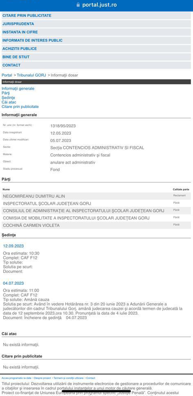 Profesorul de filosofie Alin Negomireanu, cu o experiență în învățământul preuniversitar și universitar de aproape 20 de ani, se judecă, din mai, cu Inspectoratul Școlar Județean Gorj, Consiliul de Administrație al instituției, Comisia de Mobilitate a ISJ și cu profesoara Carmen Violeta Cochină.