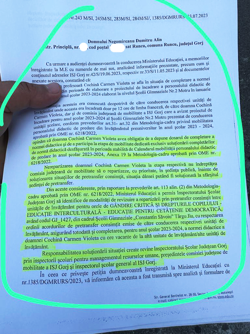 În luna aprilie a acestui an, comisia de mobilitate a ISJ Gorj a desemnat o altă profesoară, Carmen Violeta Cochină, la catedra de de Educație Socială, cu șase ore pe săptămână, la Școala Gimnazială ,,Constantin Săvoiu” – Târgu Jiu. Profesoara Cochină nu-și depusese dosarul, în februarie, susține profesorul Negomireanu, pentru completarea normei didactice – așa cum prevăd normele legale, dar a ajuns profesoară la cea mai mare școală gimnazială din județ. Potrivit metodologiei cadru, profesoara n-ar fi avut ce să caute într-un asemenea post, pentru că, pur și simplu nu-și depusese dosarul la ISJ, așa cum prevede calendarul mobilității cadrelor didactice pentru anul școlar 2022-2023.
