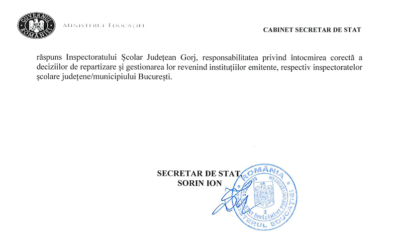 Alin Negomireanu a făcut contestație, atât la ISJ Gorj, petiționând și Ministerul Educației de unde a și primit răspunsul pe care-l redăm mai jos: