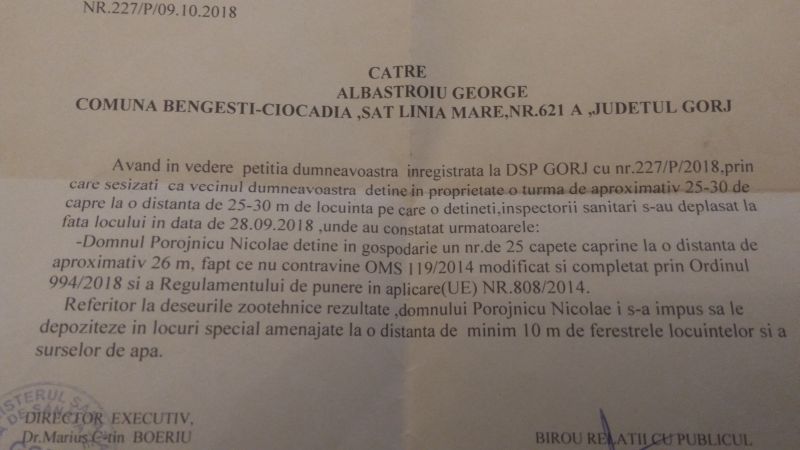 Vecinul reclamant este pensionar din petrol, după ce a lucrat patru decenii în acest domeniu.În loc să se odihnească liniștit la pensie, acesta are parte de șicanele vecinului care și-a descoperit o nouă pasiune de a crește capre. Animalele nu ar fi înregistrate, spune George Albăstroiu.