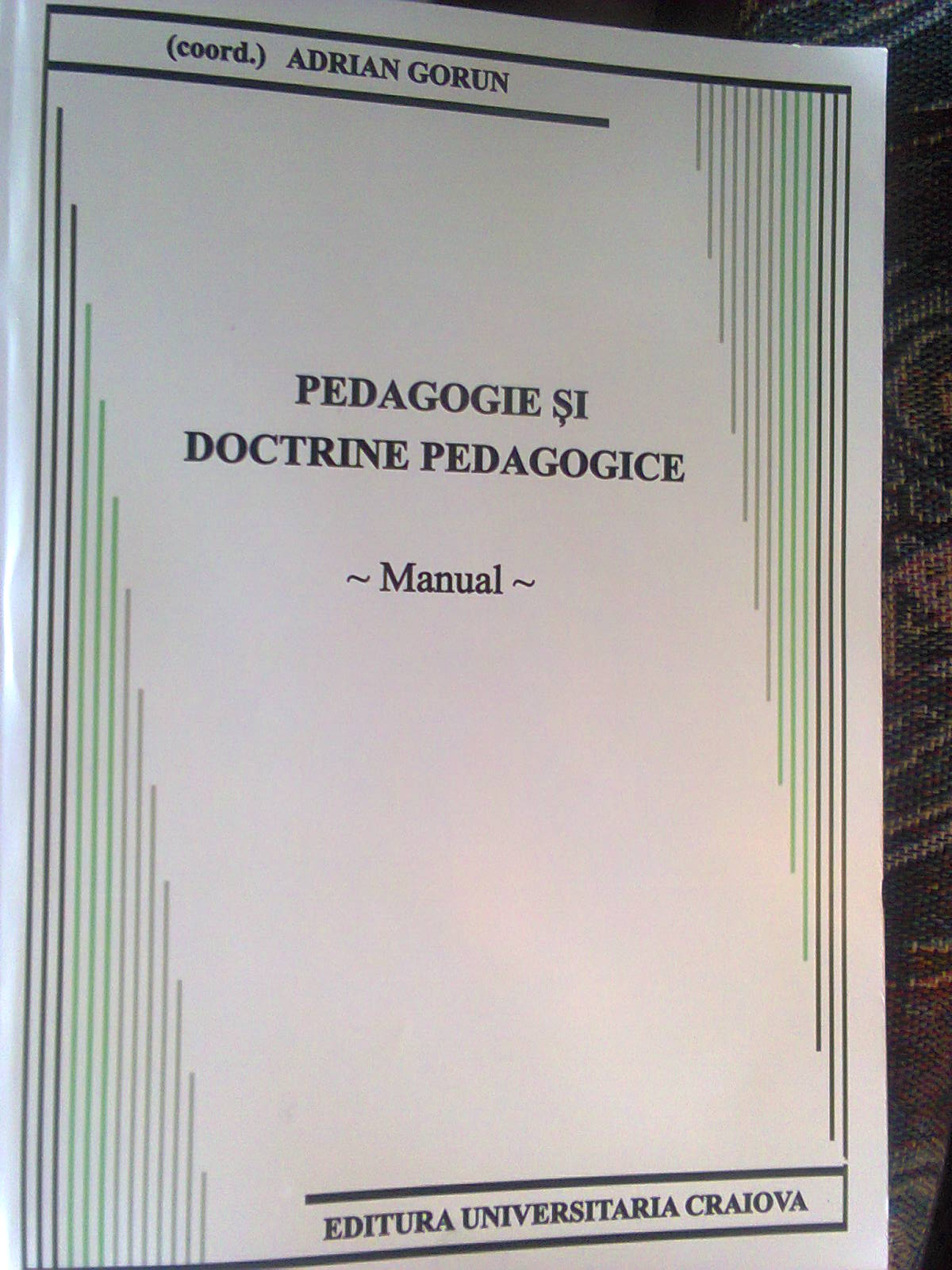 În munca neobosită şi prolifică dăruită sistemului educaţional din România, Domnul prof. univ. dr. Adrian GORUN, Preşedintele Senatului Universităţii «Constantin Brâncuşi» din Târgu-Jiu, personalitate cu o expertiză deosebită în managementul procesului instructiv-educativ local, dar, mai ales naţional, omul de carte şi vizionarul care a acumulat o experienţă vastă, exercitând o vreme îndelungată funcţia de ministru secretar de stat în Ministerul Educaţiei Naţionale, se prezintă în faţa cercetătorilor de specialitate în calitate de autor principal şi de coordonator al cărţii: «PEDAGOGIE ŞI DOCTRINE PEDAGOGICE – Manual», apărută sub egida Editurii UNIVERSITARIA din Craiova, printr-o lucrare ce se adresează în egală măsură studenţilor care se pregătesc pentru cariera didactică, personalului didactic din învăţământul preuniversitar şi din sistemul învăţământului superior, tuturor celor care sunt direct interesaţi de întreaga evoluţie istorică a pedagogiei ca ştiinţă de sine stătătoare. După cum însuşi domnul Adrian Gorun mărturiseşte, această lucrare este elaborată şi aproape finalizată prin contribuţia unui valoros colectiv care acumulează ani buni de experienţă în activitatea didactică şi de inovare pedagogică, dar şi prin aportul unor tineri talentaţi, cu preocupări şi cu multe calităţi confirmate prin activitatea de cercetare ştiinţifică, preocupaţi îndeaproape de educaţie, învăţământ, formare individuală şi formare continuă, educaţie formală, informlă şi non-formală, ideal educaţional şi capital educaţional, pentru a vădi în ultimă instanţă finalităţile educaţiei, criteriile de evaluare şi calitatea în educaţie, mai ales că lucrarea vine în sprijinul celor care se pregătesc pentru susţinerea examenelor de definitivare în învăţământ şi pentru obţinerea gradelor didactice de către profesori, institutori, învăţători.
