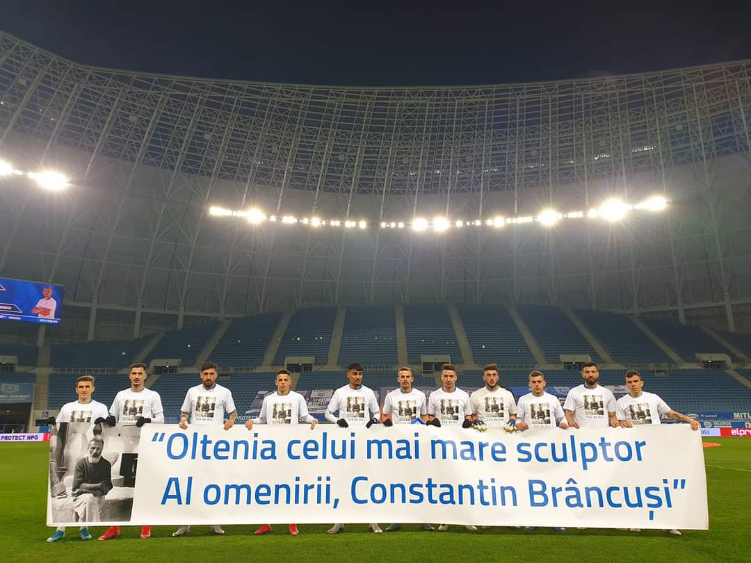 Înaintea partidei de astăzi din Bănie, oficialii celor de la Universitatea Craiova, au pregătit un moment emoționant în amintirea celui care a fost Constantin Brâncuși. Chiar în momentul în care au intrat pe teren, cu puțin timp înaintea duelului cu Hermannstadt, din etapa a 24-a a Ligii 1, elevii lui Marinos Ouzounidis purtau tricouri albe pe care a fost imprimat chipul celui mai mare sculptor român, dar și unul dintre cei mai importanți din istoria lumii. Mai mult, oltenii au pregătit și un banner.