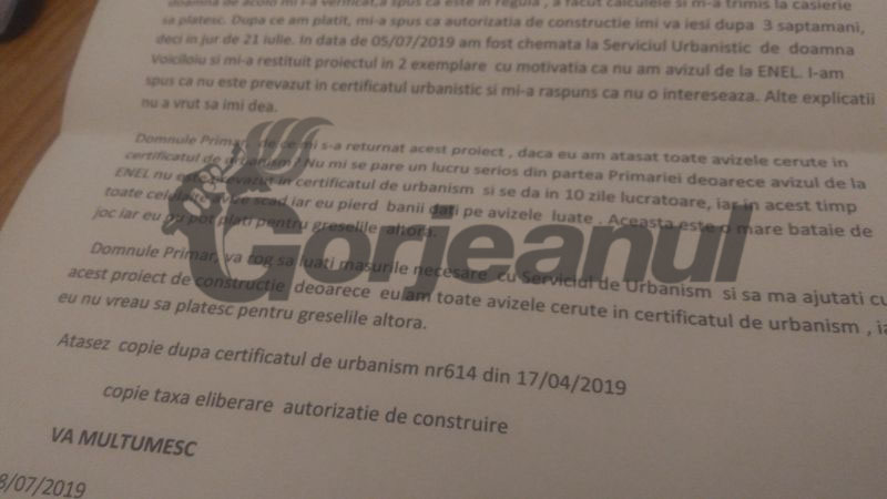 ,,Domnule Primar, de ce mi s-a returnat acest proiect, dacă eu am atașat toate avizele cerute în certificatul de urbanism? Nu mi se pare un lucru serios din partea Primăriei, deoarece avizul de la ENEL nu este prevăzut în certificatul de urbanism și se dă în 10 zile lucrătoare, iar în acest timp toate celelalte avize scad, iar eu pierd banii dați pe avizele luate. Aceasta este o mare bătaie de joc, iar eu nu pot plăti pentru greșelile altora”, se arată în reclamația depusă pe 8 iulie 2019 la Primăria Târgu-Jiu.Nu este pentru prima dată când la Serviciul Urbanism al Primăriei Târgu-Jiu apar astfel de probleme.