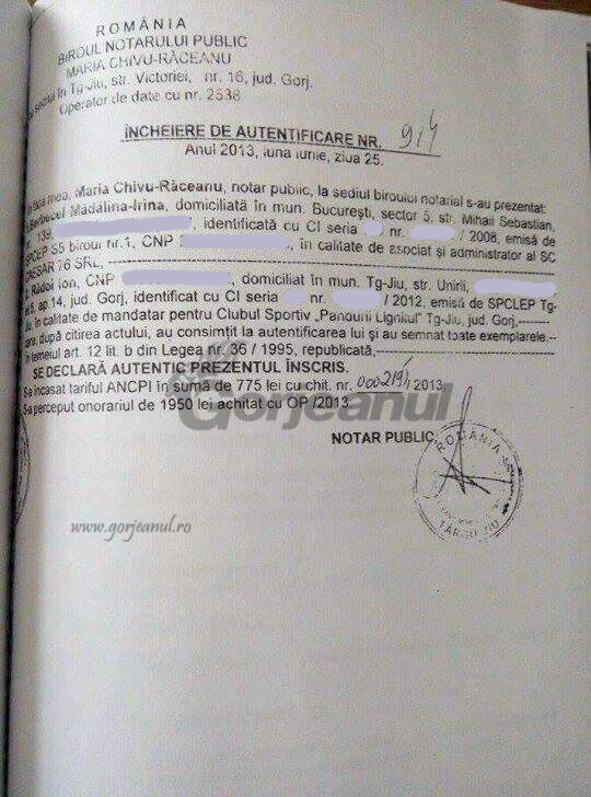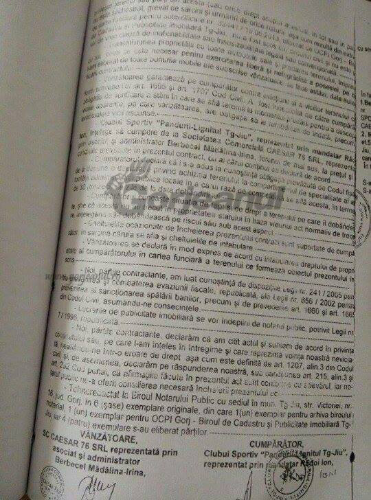 Potrivit documentului publicat de Gorjeanul, tranzacția se parafează la un notariat din Târgu-Jiu, situat lângă sediul din Victoria al Clubului, în iunie 2013, iar banii intră în ziua de 25 iunie 2013 în contul firmei lui Berbecel. La ceva timp după cumpărarea terenului, pentru club, pe acesta au răsărit niște sere de legume, unde Condescu și Berbecel s-au gândit să folosească, în interes propriu, pământul plătit de Pandurii. Cel puțin asta susține, unul dintre reclamanții care au depus la DNA documente în acest sens.