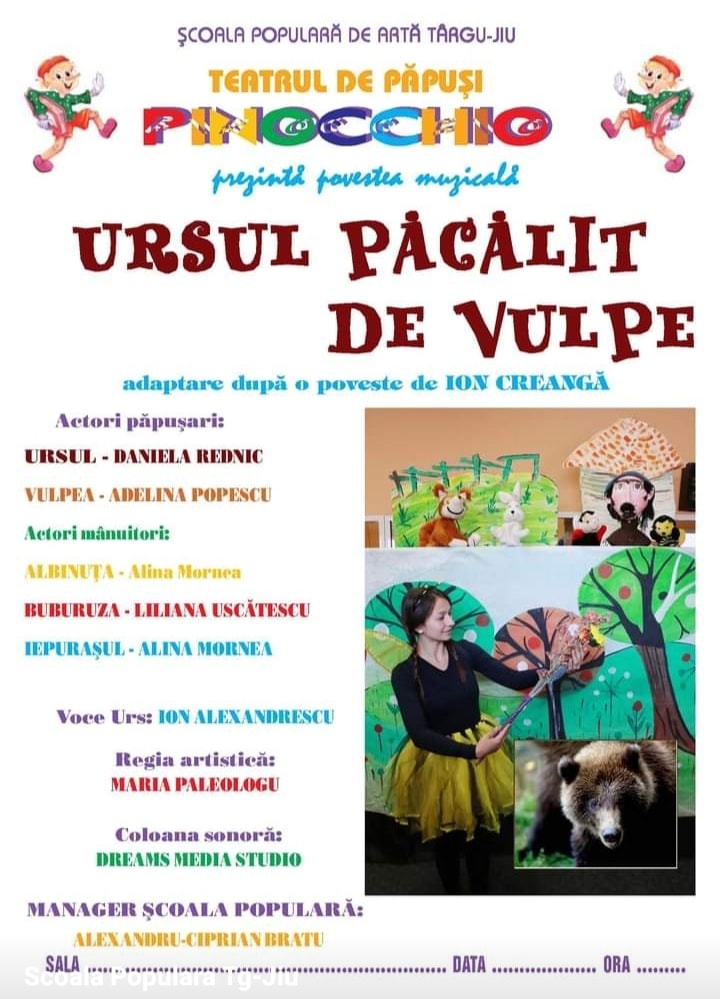 Duminică, 26 septembrie 2021, ora 11:00, Teatrul de păpuși ”Pinocchio” prezintă piesa ”Ursul păcălit de vulpe”, o reprezentație plină de culoare și voie bună. ”Actorii care dau viață personajelor pline de energie sunt: Georgiana Găvan, Adelina Popescu, Alina Mornea și Daniela Rednic. Regia artistică aparține doamnei Maria Paleologu. Spectacolul se va desfășura pe scena Teatrului de Vară din Târgu Jiu. Prețul unui bilet este de 7 lei! Biletele se pot achiziționa înainte de începerea reprezentației. În caz de vreme nefavorabilă, spectacolul va fi reprogramat la o dată ulterioară!”, au anunțat organizatorii.