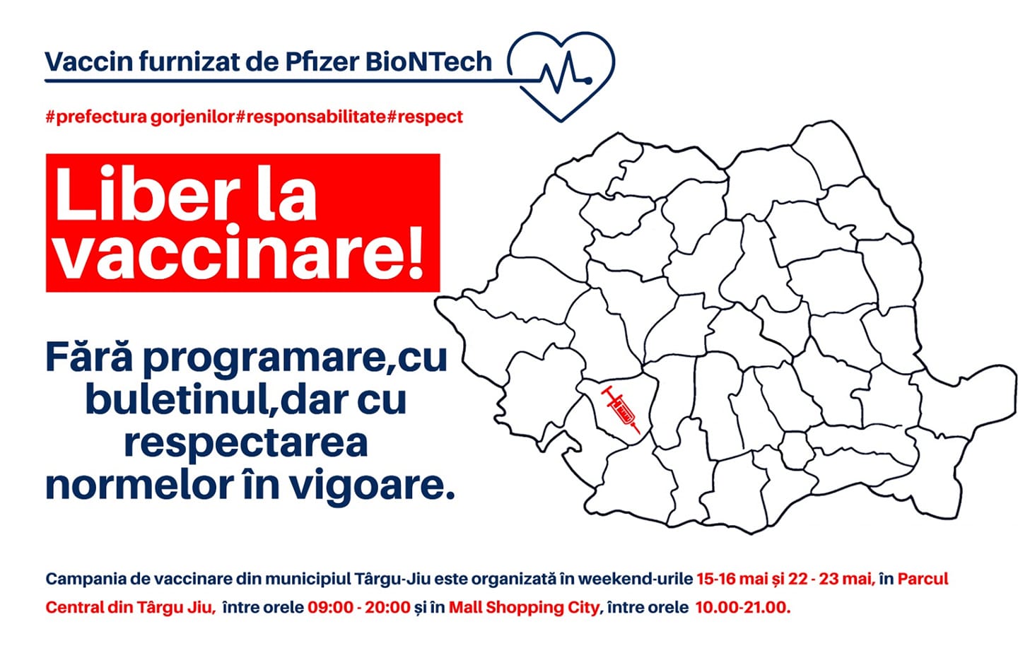 „Dăm liber la vaccinare gorjenilor care doresc să o facă! Fără programare, doar cu buletinul, dar cu respectarea normelor în vigoare! Campania de vaccinare din municipiul Târgu-Jiu este organizată în weekend-urile 15-16 mai și 22-23 mai, în Parcul Central din Târgu-Jiu, între orele 9.00-20.00 și în Mall Shopping City, între orele 10.00-21.00. Mulțumiri pentru sprijinul acordat acestei campanii adresez în special cadrelor medicale care se vor afla la cele două centre, Direcției de Sănătate Gorj și Ministerului de Interne. Gorjenii au demonstrat că sunt responsabili, acum e rândul nostru, al autorităților, să venim în sprijinul lor și să le oferim încă o șansă la normalitate”, a transmis prefectul de Gorj.