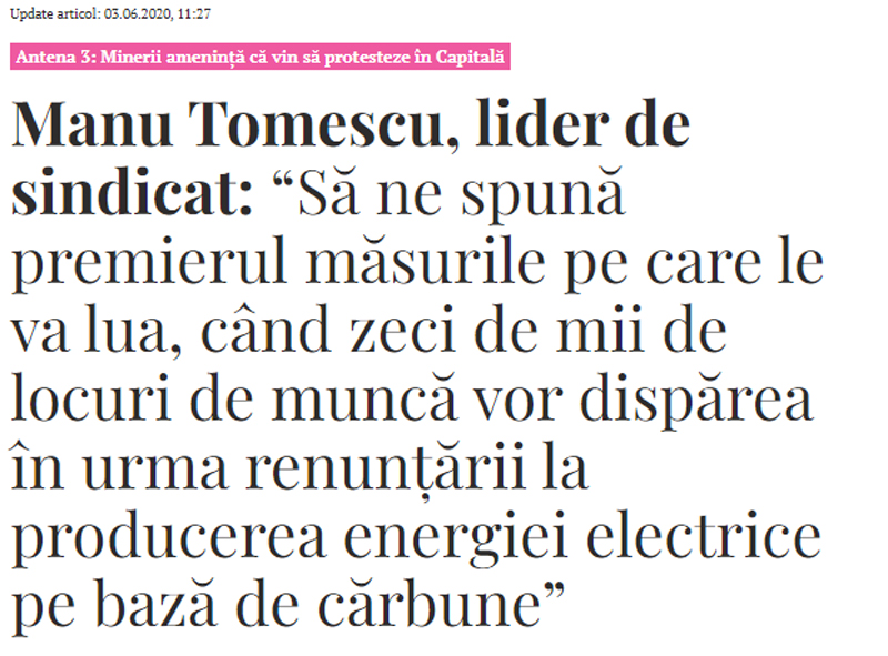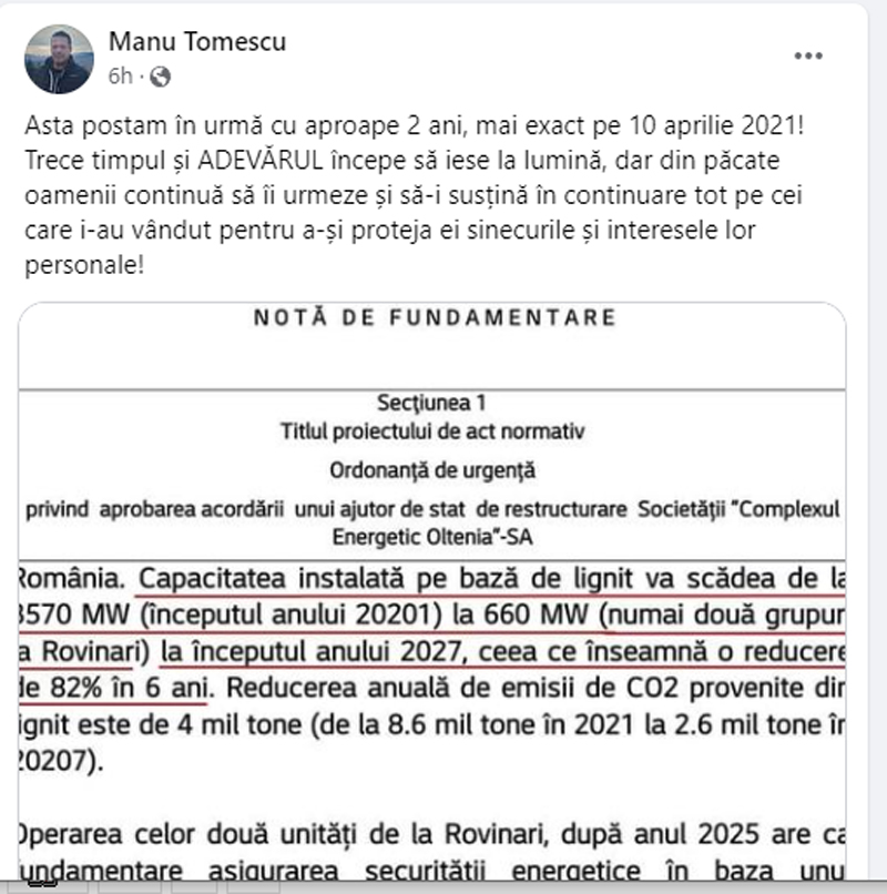 Planul de decarbonizare pe care și PSD și PNL l-au votat într-o formă MAI AGRESIVĂ DECÂT SCRIE ÎN PNRR , poate ei știu mai multe. De ce să votezi mai agresiv, poate că planul de restructurare care este secret are niște lucruri asumate acolo…. Comisia europeană a informat țările membre că există disponibilitate să se rediscute situațiile influențate de războiul din Ucraina. Noi avem un război apărut după ce s-a asumat un plan de decarbonizare, avem situații în care România dă energie Republicii Moldova și toată comunitatea europeană susține să se întâmple acest lucru, Avem situația în care CEO produce energie mai ieftină decât importă România și, cu toate astea, ei nu fac decât să se uite cum se închide CEO. Noi n-am văzut o cerere pe care Comisia Europeană s-o refuze. N-am văzut din partea României o cerere de prelungire a producerii energiei pe cărbune. Dacă am vedea o astfel de cerere refuzată, atunci, da, am putea spune că cei de la Comisia Europeană sunt niște nebuni, dezinteresați de situația României. Însă Guvernul nu a trimis o astfel de solicitare”, a declarat ieri, președintele USR, deputatul Radu Miruță.