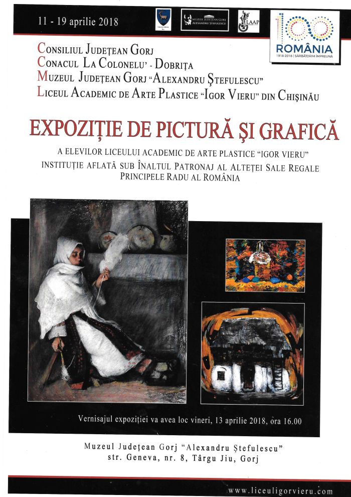 Petre Bumbaru, proprietarul conacului ,,LA COLONELU,, din Dobrița-Gorj, cu sprijinul Consiliului Județean Gorj și al Muzeului Județean Gorj, organizează expoziția de pictură și grafică a elevilor Liceului Academic de Arte Plastice ,,Igor Vieru” din Chișinău. Vernisajul va avea loc vineri, 13 aprilie 2018, la ora 16.00. Lucrările sunt realizate atât în cadrul atelierelor liceului, cât și în tabara de creație ce se desfășoară în perioada 11-19 aprilie la conacul ,,LA COLONELU”. La eveniment vor participa personalități  politice ale orașului, precum și cadre didactice, elevi și studenți.