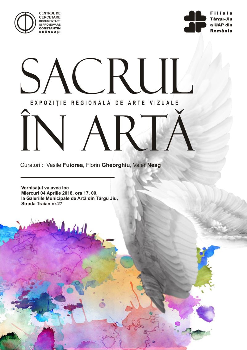 Filiala Târgu-Jiu a UAP din România, în parteneriat cu Centrul de Cercetare, Documentare și Promovare Constantin Brâncuși, organizează, miercuri, 04 Aprilie 2018, ora 17.00, vernisajul expoziției Regionale de Arte Vizuale „SACRUL ÎN ARTĂ” al membrilor UAP din România. Curatori: Vasile Fuiorea, Florin Gheorghiu, Valer Neag. Expoziția este deschisă publicului în perioada 04 Aprilie– 24 Aprilie 2018.