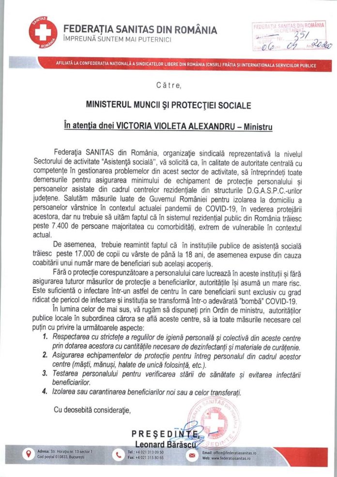 Având în vedere situația angajaților din instituțiile publice de asistență socială, în contextual pandemiei cu COVID-19, precum și problemele comunicate de membrii nostri de sindicat, Federația SANITAS a solicitat Ministerului Muncii: