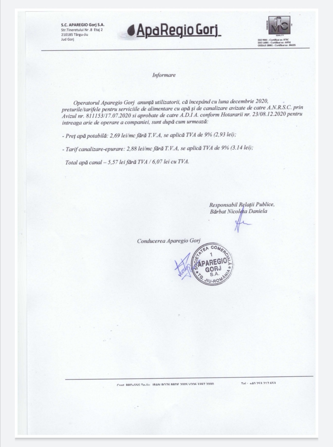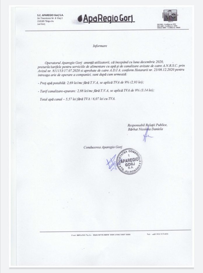 Vezi noile prețuri la serviciile apă-canalizare ale Aparegio Gorj!