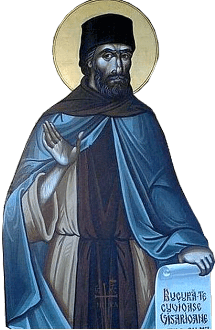 Sfântul Cuv. Visarion s-a născut și a crescut în Egipt, unde, din tinerețe L-a iubit pe Hristos și a răsărit în inima lui lumina darului lui Dumnezeu. S-a păzit curat de toată întinăciunea păcatului, nepătându-și haina cea duhovnicească, pe care a luat-o de la Sfântul Botez, iar, cercetând sfintele locuri de la Ierusalim, a văzut pe Cuviosul Gherasim, care-și petrecea viața în pustiul Iordanului și căruia îi slujea un leu. Văzând și pe mulți alți părinți care viețuiau acolo prin felurite locuri și care străluceau în fapte bune și, vorbind cu dânșii, a câștigat mult folos sufletului său. Împărțindu-și săracilor și mănăstirilor averea rămasă de la părinți, s-a lepădat de lume și s-a făcut monah, ducându-se într-un loc pustiu unde petrecea în liniște cu nevoințe pustnicești, deoarece postirea lui era fără de măsură, pentru că uneori nu mânca toată săptămâna, iar alteori petrecea fără de hrană și fără de băutură patruzeci de zile. Într-una din zile, stând în mijlocul unor mărăcini și având mâinile, ochii și mintea îndreptate către cer, neclintit ca un stâlp, nici mișcându-se câtuși de puțin cu trupul din locul acela, nici gustând ceva în acele zile, nici grăind ceva către cineva, nici dormitând, nici slăbind din neputința cea firească și nici aplecându-și mintea sa spre cele pământești, ci fiind cu totul întraripat de dragostea lui Dumnezeu. Cuviosul Visarion a îndulcit amărăciunea apei de mare, prin rugăciune și prin însemnarea sfintei cruci, ca să adape pe ucenicul lui cel slăbit de sete, căci, umblând el cu ucenicul în pustie pe marginea mării, acesta a însetat de osteneala drumului și de zăduful zilei și zicea către sfântul: „Părinte, îmi este tare sete”, iar, cuviosul, făcând rugăciune și însemnând marea cu semnul Sfintei Cruci, a zis: „În numele Domnului, ia apă și bea”, iar, ucenicul luând apă din mare cu vasul ce-l purta, a văzut că apa este dulce la gust și rece, ca și cum ar fi curs dintr-un izvor viu. Mergând el cu ucenicul la un stareț, se apropia soarele spre apus și calea era încă depărtată; deci Sfântul Visarion s-a rugat lui Dumnezeu, zicând: „Rogu-mă Ție, Doamne, poruncește ca să stea soarele până ce voi merge la robul tău”, şi așa s-a făcut, că n-a apus soarele până ce a sosit cuviosul la acel stareț.