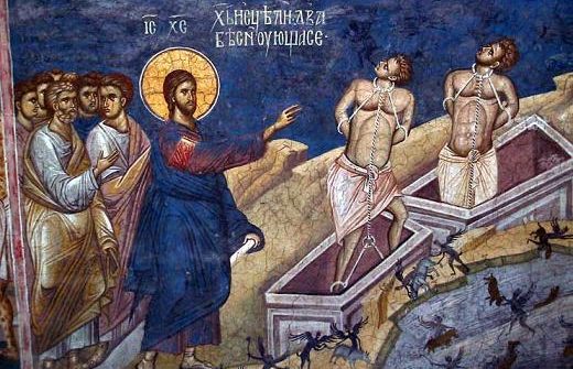În Duminica a 5-a după Rusalii; Ap. Romani 10, 1-10; Ev. Matei 8, 28-34; 9,1 (Vindecarea celor doi demonizaţi din ţinutul Gadarei); glas 4, voscr 5, Sfânta şi Dumnezeiasca Liturghie relatează minunea vindecării a doi oameni posedaţi de duhuri necurate sau îndrăciţi, cum mai sunt numiţi, deci, doi demonizaţi din ţinutul Gadarenilor, care, văzându-L pe Iisus apropiindu-Se de ei, au strigat: «Ce este nouă şi Ţie, Iisuse, Fiul lui Dumnezeu? Ai venit aici, înainte de vreme ca să ne chinuieşti?», iar, în acest fel, ei arată că văd în Domnul un chinuitor şi prin acest lucru, au preferat să stea în închisoarea sufletelor lor ca demoni, refuzând să deschidă calea Mântuitorului, Care are putere asupra iadului şi a morţii! Prin urmare, Mântuitorul venise în ţinutul Gadarei, unde a fost întâmpinat de doi demonizaţi care locuiau în morminte şi care îi îngrozeau adeseori pe localnici şi pe toţi cei ce treceau prin ţinuturile acelea. Pentru siguranţă, locuitorii i-au legat de mai multe ori în lanţuri, dar cu putere diavolească, aceştia au rupt de fiecare dată lanţurile şi nimeni nu reuşea să-i potolească! Deci, a venit Domnul şi, văzându-L de departe, demonizaţii s-au apropiat de El, iar diavolii, prefăcându-se că Îl roagă să nu-i pedepsească prin aruncarea lor în valurile mării, I-au cerut ca după e îi va scoate, să-i lase să intre într-o turmă de porci care păştea în locul acela. Şi au ieşit diavolii, care erau «legiuni» şi au intrat în turma de porci, iar turma s-a aruncat de pe ţărm în mare. Atunci, păzitorii porcilor, îngroziţi de ceea ce s-a întâmplat, au alergat în cetate ca să le spună stăpânilor despre pierderea turmei de porci, după care locuitorii cetăţii, constatând paguba şi văzând pe cei doi care fuseseră mai înainte îndrăciţi, că acum şedeau liniştiţi înaintea Lui Iisus, L-au rugat pe Dumnezeu să plece din ţinuturile lor, iar, Dumnezeu doreşte să ne împărtăşească o învăţătură extrem de folositoare şi ne îndeamnă ca să-L chemăm pe Iisus Hristos Domnul, să Se sălăşluiască în sufletul nostru!