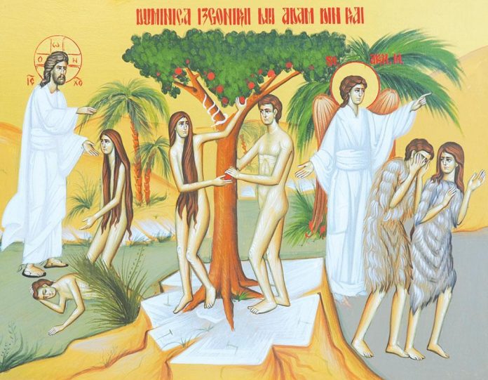 Duminica dinaintea Postului Mare aduce în faţa noastră ziua închiderii paradisului şi punerea lui sub paza heruvimilor cu sabie de foc, aşa că primele trei capitole ale Genezei expun, fără simplificare de cuvinte, informaţii legate de om, de opera de creare, realizată într-un mod progresiv, care corespunde planului divin, potrivit căruia, după ce Dumnezeu, în primele cinci zile, a făcut cerul şi pământul, lumina, mările, uscatul şi vegetaţia, soarele, luna şi stelele, după ce a binecuvântat apele şi pământul ca să scoată fiinţe vii, în ziua a şasea l-a făcut pe om, zicând: «Să facem om după chipul şi după asemănarea Noastră» (Facerea 1, 26), şi în acest fel, Dumnezeu l-a făcut pe om după chipul Său (v. 27), ca o icoană a originalului sau a arhetipului, mai ales că asemănarea este o identificare a icoanei cu arhetipul. Am putea spune că avem întipărit în noi, haric şi personal, însuşi chipul Fiului lui Dumnezeu! Iar, pentru că asemănarea omului cu Dumnezeu este un proces dinamic pe care îl realizează fiecare potrivit liberului arbitru, în cel de-al doilea capitol al Genezei, Moise, prorocul, prezintă amănunte legate de maniera în care a fost făcut omul: «Atunci, luând Domnul Dumnezeu ţărână din pământ, a făcut pe om şi a suflat în faţa lui suflare de viaţă şi s-a făcut omul fiinţă vie» (Facerea 2, 7), din care putem înţelege că natura omului este dublă: materială (ţărâna) şi spirituală (suflarea de viaţă), deci, omul a primit viaţă din viaţa lui Dumnezeu. Şi după ce Dumnezeu l-a făcut pe om, a sădit raiul, simbol al veacului viitor, şi l-a pus acolo pe Adam, omul pe care-l zidise, deci, paradisul era chipul omului dinlăuntru, mai ales că în mijlocul acestui paradis, uşor supuşi simţurilor şi materiei erau doi pomi: pomul vieţii şi pomul care mijlocea cunoştinţa binelui şi răului şi care prin ascultare ducea la binele vieţii, iar prin neascultare îl cobora pe om la răul şi întunericul morţii (v. 9). Îndată, Dumnezeu, ca un părinte bun, i-a făcut o concesiune lui Adam, spunându-i: „Din toţi pomii din rai poţi să mănânci. Iar din pomul cunoştinţei binelui şi răului să nu mănânci, căci, în ziua în care vei mânca din el, vei muri negreşit!” (vv. 16-17), fiind vorba, desigur, despre o moarte spirituală, pentru că Adam, după ce a mâncat, a trăit până la 930 de ani! Se spune că pomul acesta avea roade de tot felul, care nu se stricau şi nu se împuţinau niciodată, iar, atenţionarea Lui Dumnezeu este condiţionată de o singură oprelişte, cu toate că nu opreliştea îl va face pe om muritor, ci neascultarea, adică, exercitarea liberei sale alegeri, deci, înţelegerea greştă a libertăţii de către om va fi cauzatoare de moarte. Ca urmare, în această atmosferă paradisiacă, Dumnezeu a găsit de cuviinţă să-i facă omului ajutor pe măsură, ca să nu fie singur şi a coborât un somn greu asupra lui Adam, ca să participe într-un mod profetic sau vizionar la opera de creare a femeii, fiindcă, Adam, fiind în somn, Dumnezeu a luat una din coastele lui şi a plinit locul ei cu carne, deci, coasta luată din Adam a făcut-o femeie, după care Adam, văzându-o, a zis: «Iată, aceasta-i os din oasele mele şi carne din carnea mea» (vv. 21-24), vrând să arate înrudirea dintre ei, mai ales că în această stare ei aveau o frumoasă relaţie de comuniune