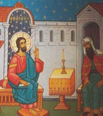 În Duminica dinaintea Înălţării Sfintei Cruci; Ap. Galateni 6, 11-18; Ev. Ioan 3, 13-17 (Convorbirea lui Iisus cu Nicodim); glas 5, voscr.3, în cadrul Sfintei Liturghii oficiate în Biserica noastră Ortodoxă este rânduit să se citească un text din Sfânta Evanghelie care descrie convorbirea sau dialogul Mântuitorului Hristos cu Nicodim, pentru a ne arăta că jertfa de pe cruce, deci, vina păcatului nostru a fost ştearsă, iar prin Înviere, moartea a fost nimicită, deschizându-ni-se, astfel, porţile vieţii veşnice, pentru că împreună cu Domnul Iisus Hristos, omul cel vechi din noi s-a răstignit şi s-a îngropat, dar, tot prin El a înviat în noi omul cel nou, eliberat din lanţurile păcatului şi din frica morţii. Pericopa Evanghelică este ilustrată prin convorbirea Mântuitorului Hristos, avută la două luni după botezul Său, cu Nicodim, un fariseu bine intenţionat, membru al Marelui Sinedriu, deoarece Iisus Domnul Se găsea în Ierusalim pentru sărbătoarea Paştelui în primul an al vieţii Sale publice, iar, lumea cunoscuse deja minunile Sale şi mulţi credeau în El (v. Ioan 2,23). De aceea, preotul Nicodim voia să-L vadă mai bine pe acest vestit Iisus, cu toate că duşmanii Lui, fariseii şi ceilalţi, dăduseră poruncă neînduplecată ca oricine crede în El sau vorbeşte public despre El, să fie exclus din sinagogă, motiv pentru care Nicodim L-a întâlnit pe Hristos pe ascuns, la ceas de noapte, probabil, în casa Salomeei, mama lui Ioan, preotul Nicodim constatând că în întuneric, la lumina lumânărilor, a văzut chiar Lumina Adevărului prin care Dumnezeu ne arată că Împărăţia Sa nu poate fi cunoscută şi nici nu se dobândeşte fără o renaştere spirituală din apă şi din Duh, deschizându-ni-se, astfel, porţile vieţii veşnice!
