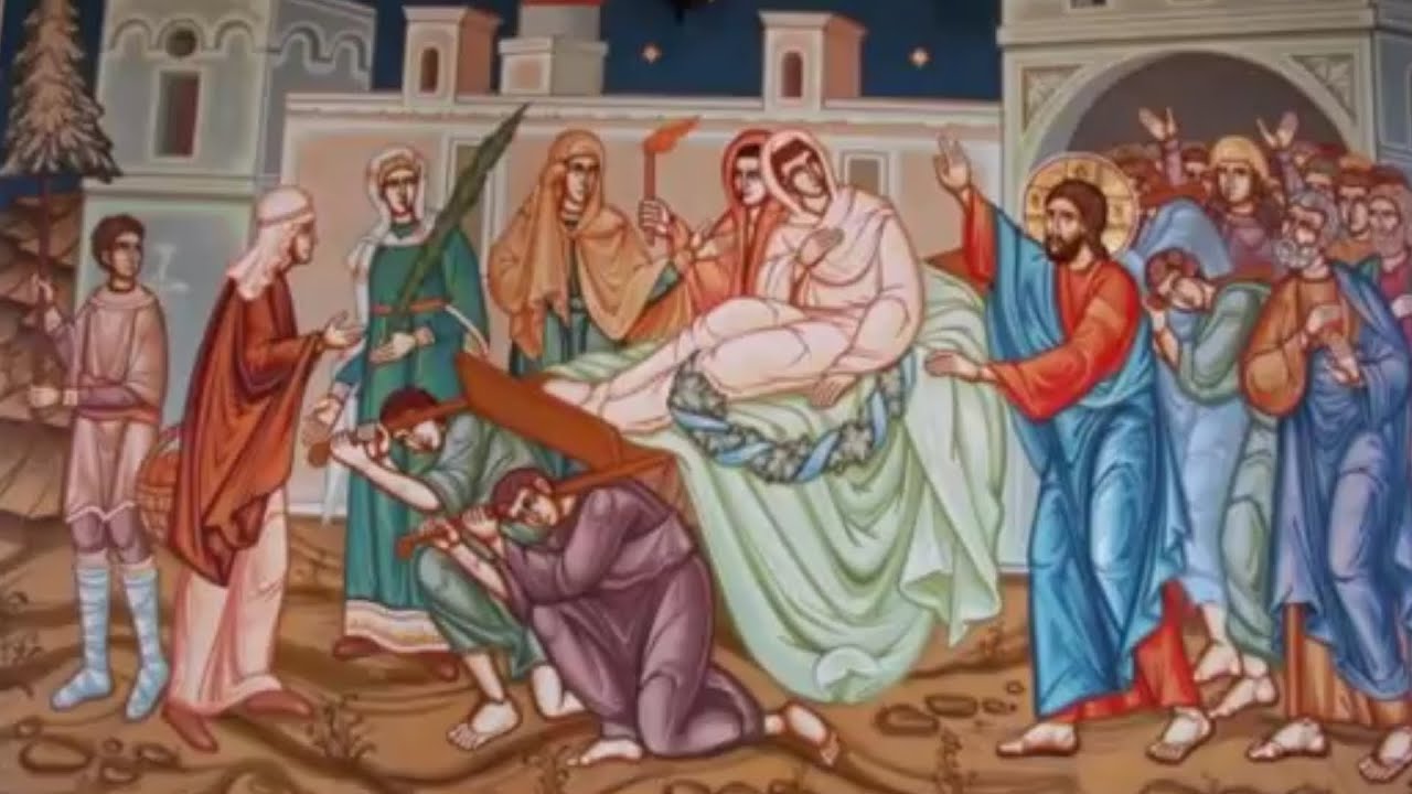 Aşadar: «În vremea aceea, S-a dus Iisus într-o cetate numită Nain şi împreună cu El mergeau ucenicii Lui şi mulţime mare. Iar când S-a apropiat de poarta cetăţii, iată scoteau un mort, singurul copil al mamei sale, şi ea era văduvă, iar mulţime mare din cetate era cu ea. Şi, văzând-o Domnul, I s-a făcut milă de ea şi i-a zis: ,,Nu plânge”! Atunci, apropiindu-Se, S-a atins de sicriu, iar cei ce-l duceau s-au oprit. Şi a zis: ,,Tinere, ţie îţi zic, scoală-te”! Iar cel ce fusese mort s-a ridicat şi a început să vorbească, iar Iisus l-a dat mamei sale. Şi frică i-a cuprins pe toţi şi slăveau pe Dumnezeu, zicând: Proroc mare S-a ridicat între noi şi Dumnezeu a cercetat pe poporul Său» (Luca 7, 11-16). Cu toate că a atinge morţii sau lucrurile dimprejurul morţilor era socotit de Legea veche o necurăţie, însă, atunci când adevărata cinstire a Lui Dumnezeu s-a împuţinat, şi cu ea şi preţuirea vieţii omeneşti, multe aşezăminte, printre care şi acesta, au ajuns prejudecăţi, dar, pentru că viaţa şi mântuirea sunt mai de seamă decât tradiţiile şi obiceiurile, chiar şi minunea învierii săvârşite de Domnul a fost atât de răvăşitoare încât bătrânii evrei au rămas fără grai şi nici n-au mai putut să scoată vreun cuvânt de împotrivire la cuvintele: „Tinere, ţie îţi zic, scoală-te!”, iar, Iisus a poruncit băiatului în numele Său, iar nu cum au făcut profeţii Ilie şi Elisei, care s-au rugat lui Dumnezeu să învie pe cel mort. Aceia erau slujitorii Dumnezeului Celui Viu, iar acesta este Unul-Născut Fiul Lui Dumnezeu Tatăl. Cu puterea Sa îi porunceşte Domnul băiatului să se întoarcă la viaţă, să se ridice din patul morţii. Cu aceste cuvinte a vrut să ne arate că a săvârşit fapta numai prin dumnezeiasca Sa putere şi că are putere asupra morţilor ca şi asupra viilor. Totodată, minunea aceasta nu s-a făcut ca un răspuns la credinţă, ci, s-a săvârşit numai prin cuvântul cel puternic al Lui Hristos, pentru că: «S-a ridicat şi a început să vorbească, iar Iisus l-a dat mamei sale», deci, făptura a auzit glasul Făcătorului şi I-a ascultat porunca. Aceeaşi putere dumnezeiască ce a insuflat lutului suflare vie, şi a făcut din pulbere om, lucrează acum. De acolo de unde se afla sufletul băiatului mort a auzit glasul Stăpânului şi într-o clipă s-a întors la trupul său, ca să împlinească porunca dumnezeiască! Tânărul s-a ridicat din raclă şi a început să vorbească îndată, pentru ca nu cumva să creadă oamenii că e doar vreun fel de nălucire, ori că vreun strigoi a intrat în trupul băiatului şi l-a ridicat din raclă. Trebuia ca toţi să audă glasul şi vorbele tânărului, ca să nu rămână vreo îndoială cu privire la faptul că el însuşi s-a întors cu adevărat la viaţă! De aceea, Domnul l-a luat pe băiat şi l-a dat mamei sale. Atunci când mama lui l-a luat şi l-a îmbrăţişat, toată îndoiala i-a părăsit pe privitori, iar, Domnul l-a dat pe fiu mamei lui ca să-i arate că este un dar, aşa cum a fost şi când l-a născut. Deci, viaţa este darul lui Dumnezeu, Cel Care dă viaţa omului din mâna Sa, când îl ia de mână pe fiecare om zidit şi-l dă acestei vremelnice vieţi pământeşti. Domnul l-a luat pe băiat de mână şi l-a dat mamei sale ca să-i arate că nu în zadar i-a spus: „Nu plânge!”, ştiind că are s-o mângâie cu adevărat, nu numai cu anumite cuvinte pe care poate că ea le mai şi auzise de multe ori spunându-i-se în ziua aceea, ci printr-o faptă cu adevărat mântuitoare! Desigur, că Domnul a mai vrut să ne arate că, atunci când săvârşim vreo faptă bună, s-o facem pe cât se poate noi înşine, cu luare-aminte şi din toată inima, nu prin alţii, nu fără grijă, pentru că Dumnezeu ne arată că prin venirea în lume a Fiului Său, învierea tânărului din Nain vesteşte şi inaugurează cu milostivire divină, însăşi biruinţa Vieţii asupra morţii!