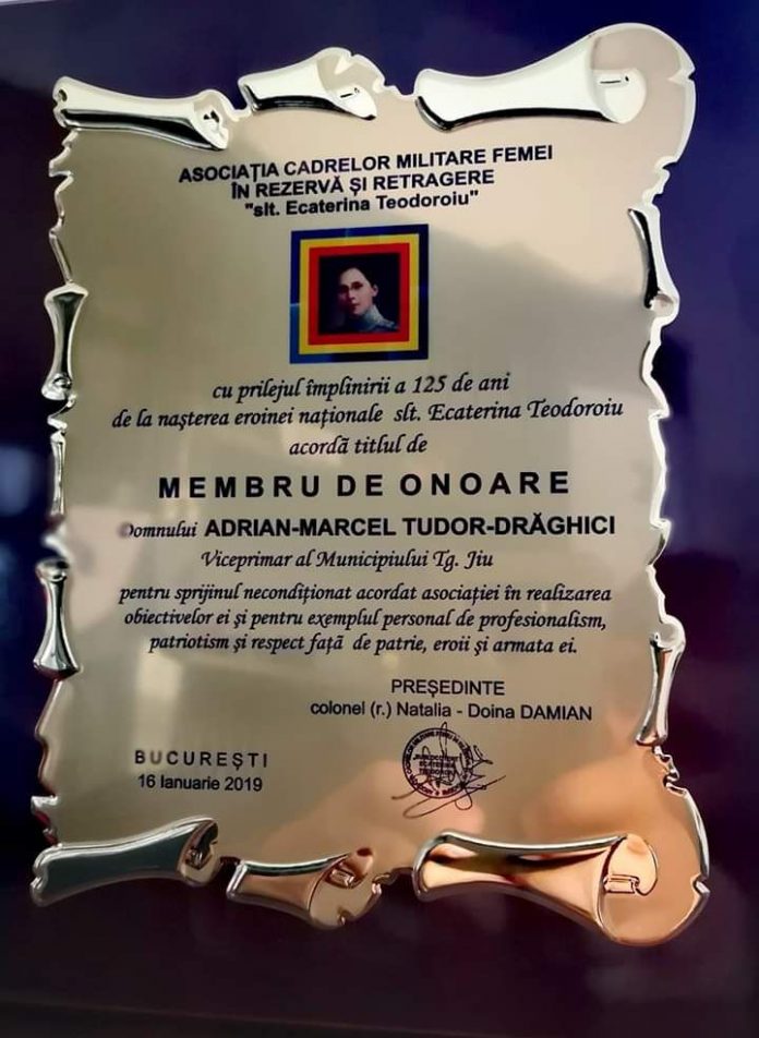 Viceprimarul municipiului Târgu-Jiu, Adrian Tudor, a primit recent o nouă distincție. Acestuia i-a fost oferită o diplomă de „Membru de onoare” din partea Asociației Cadrelor Militare Femei în Rezervă și Retragere „slt. Ecaterina Teodoroiu”, cu prilejul manifestărilor organizate la Târgu-Jiu pentru marcarea împlinirii a 125 de ani de la nașterea eroinei naționale Ecaterina Teodoroiu.