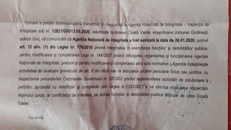 În mod surprinzător, ANI răspunde reclamantului, în scris, și îl anunță că deja din ianuarie, Agenția este pe urmele viceprimarului, care este cercetat pentru conflict de interese. Deocamdată ancheta este în curs.
