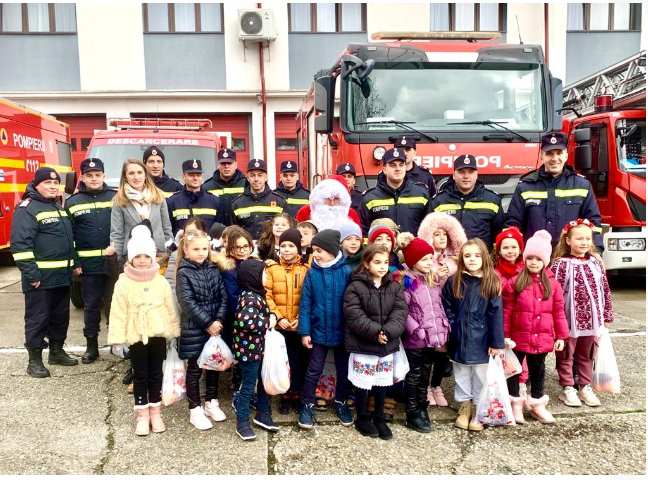 ISU Gorj a primit astăzi o trupă de mici colindători. Copiii s-au întâlnit apoi chiar cu Moș Crăciun, aflat acolo cu sacul plin, după cum povestesc pompierii.