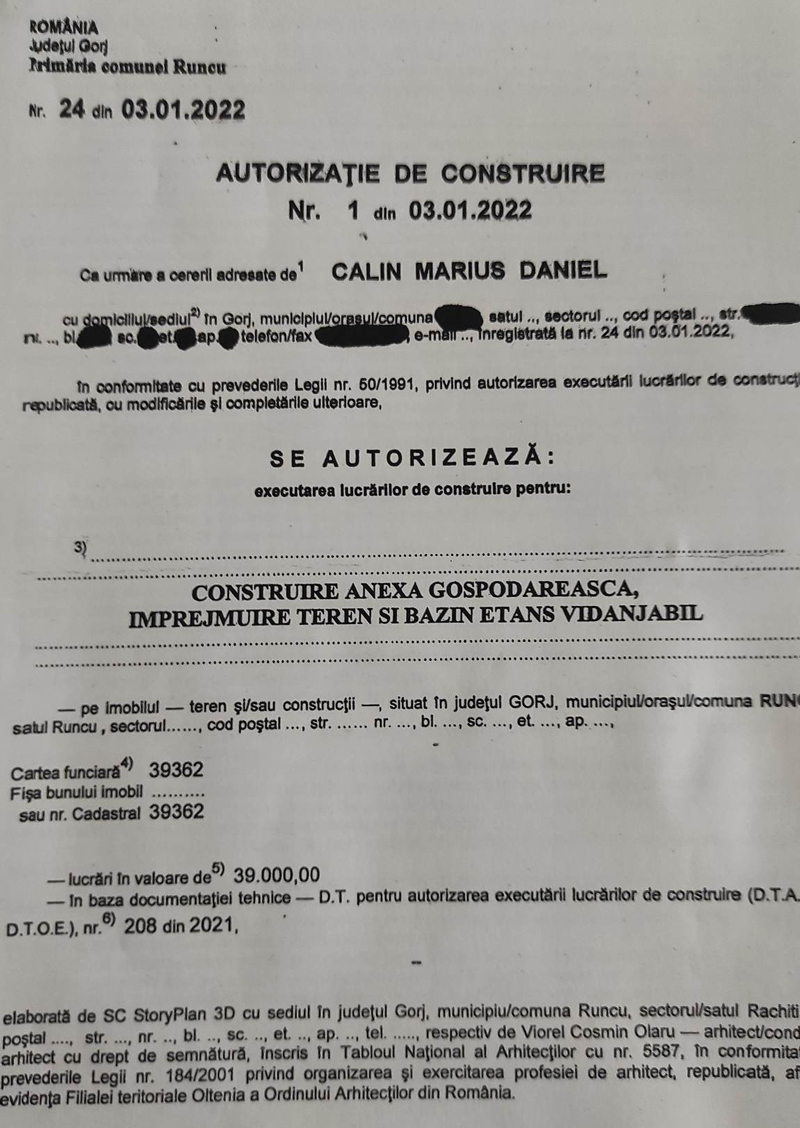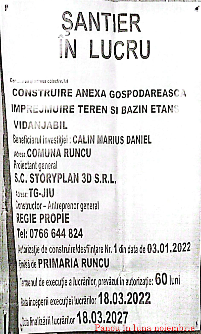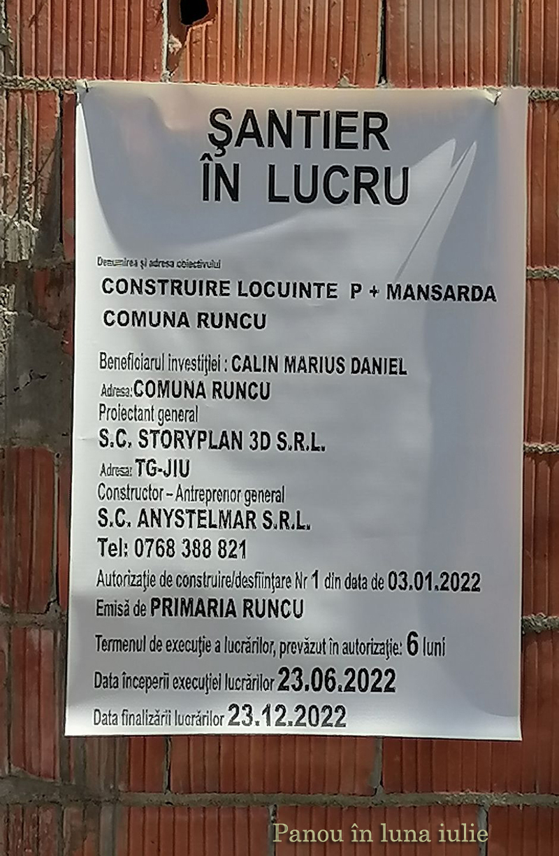 Al doilea panou, care a dispărut după câteva zile, el fiind amplasat în noiembrie pe construcția polițistului, se menționa exact ce scrie în autorizația de construire din 3.01.2022 eliberată de primăria din Runcu.