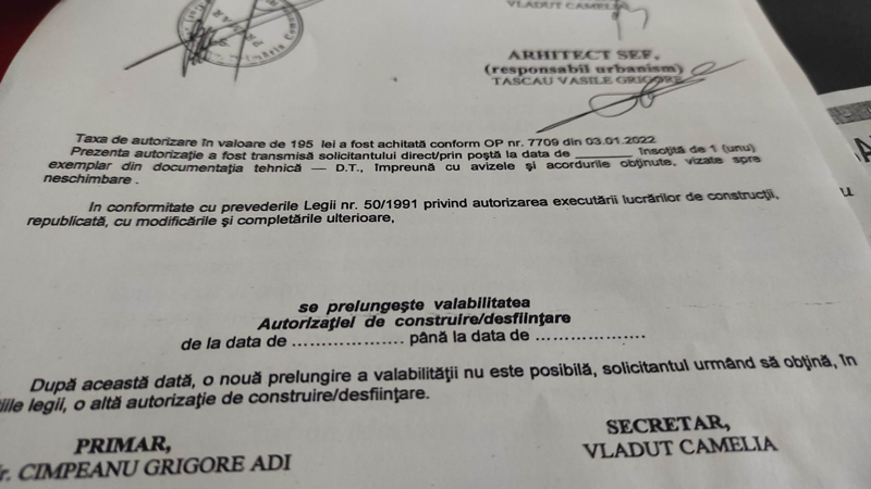 Din păcate, spusele acestuia sunt contrazise de autorizația de construcție nr.24 din 3.01.2022, în care scrie negru pe alb că pe terenul respectiv se autorizează ,,construire anexa gospodărească, împrejmuire teren și bazin etanș vidanjabil”. Mai mult, deși susține că nu construiește o casă cu mansarda pe primul panou de identificare, amplasat in iulie 2022 pe terenul respectiv, după prima sesizare a unuia dintre cei afectați, se menționează că acolo se va construi o locuință cu mansardă.