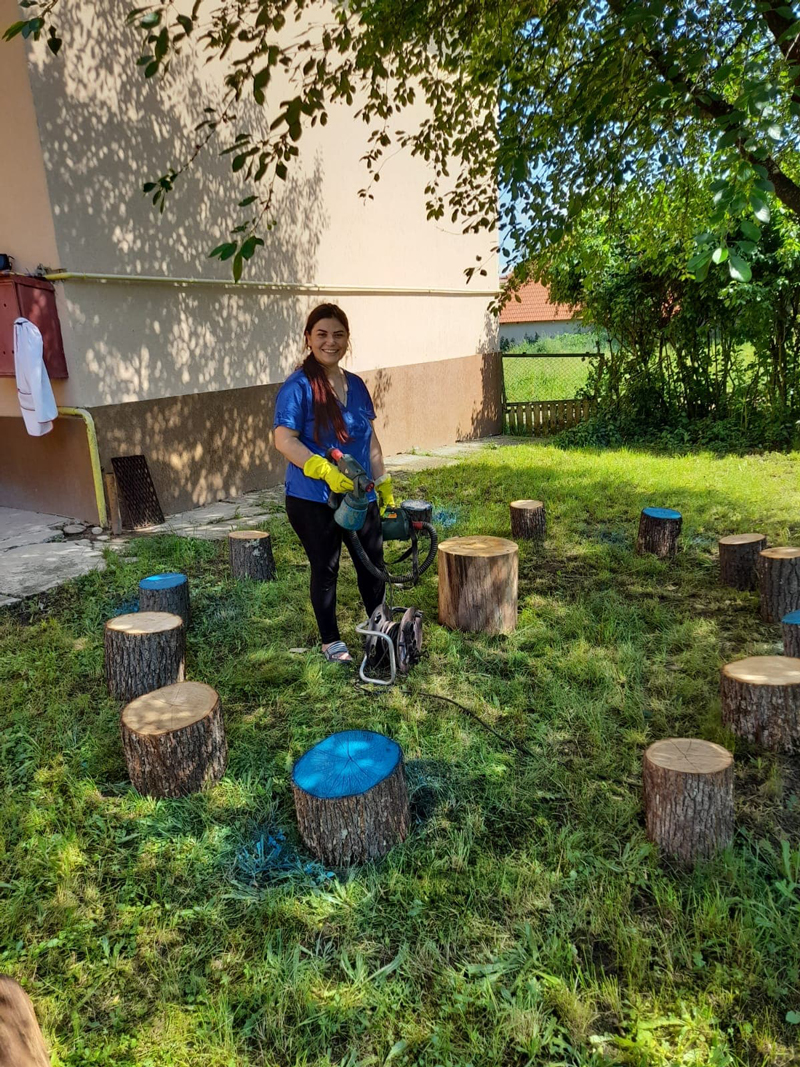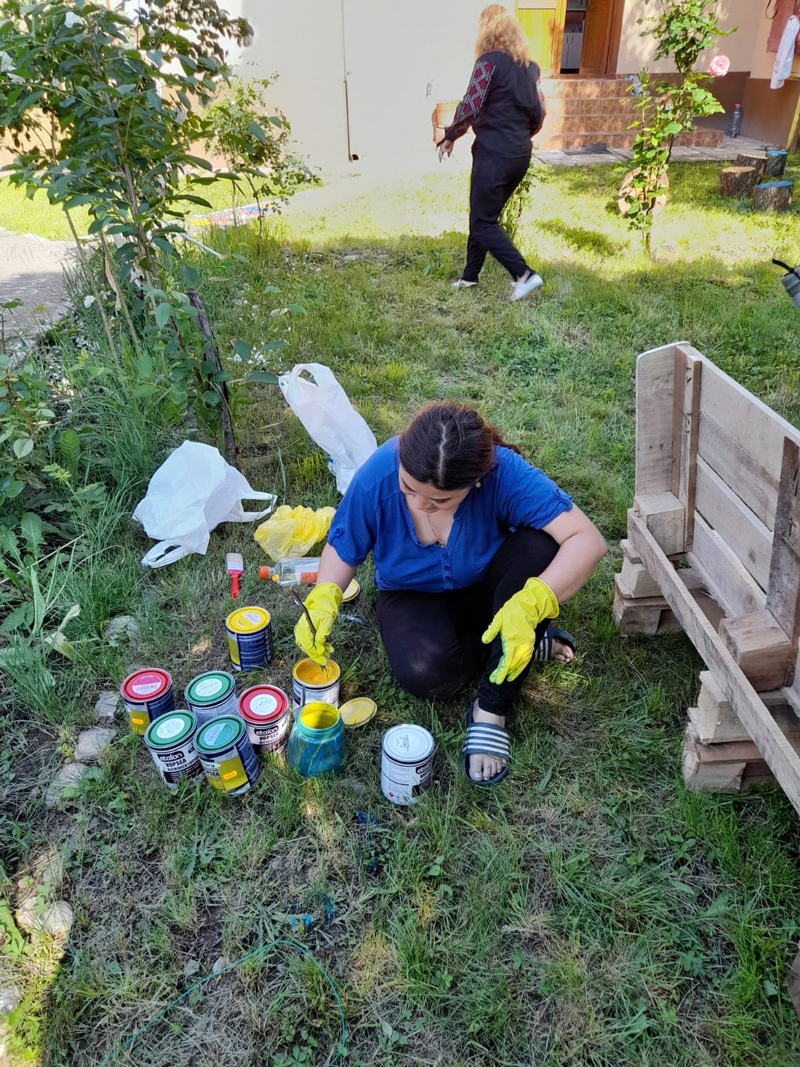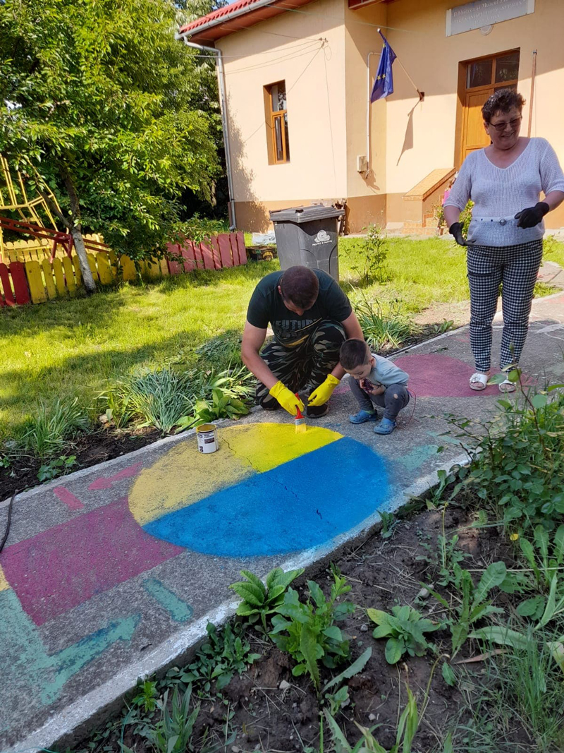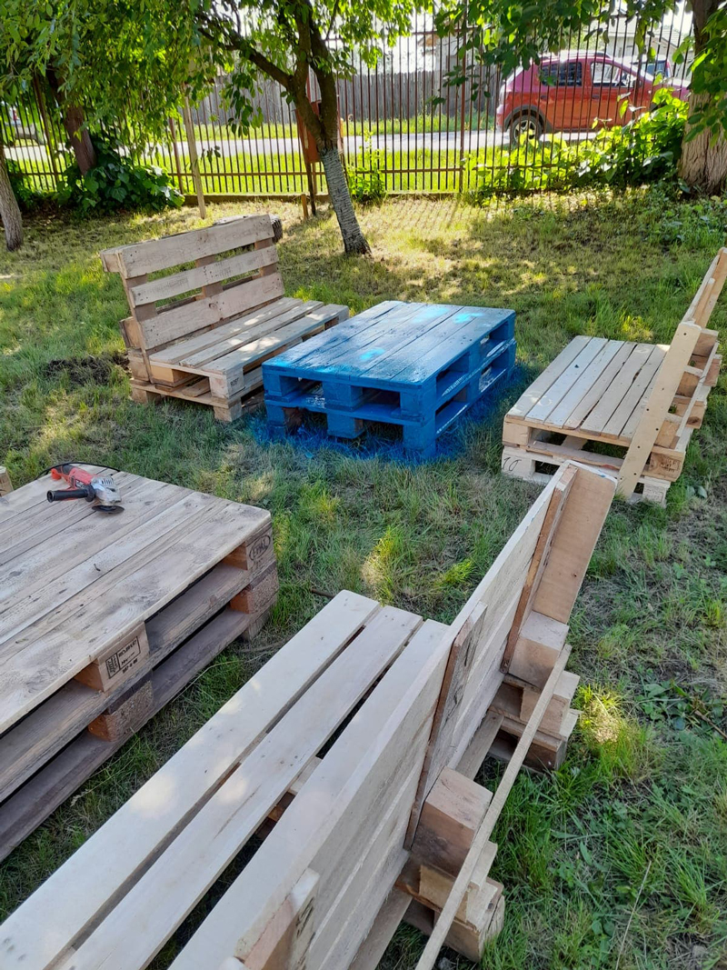 Au încropit din câțiva paleți măsuțe și băncuțe pe care le-au vopsit în culori vii și au vopsit și aleea de la intrarea în grădiniță.