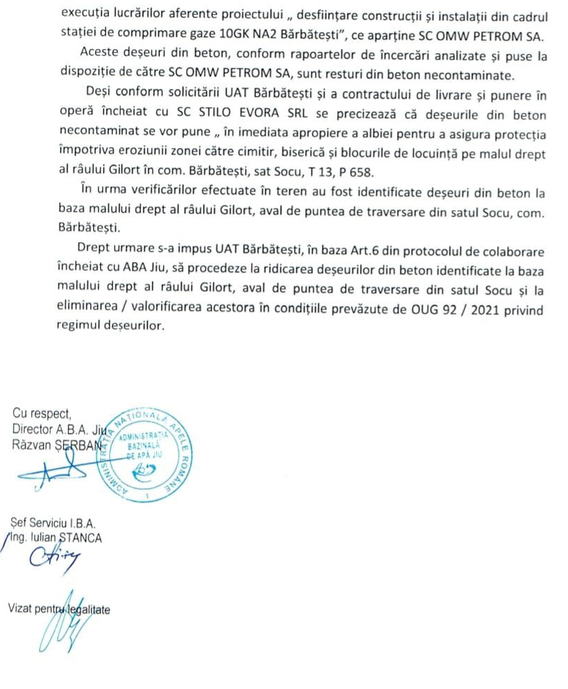 OMV a desființat, cu ani în urmă, stația de compresoare din Bărbătești. Obligată de lege să readucă terenul ocupat la stadiul inițial, OMV trebuia să mute, contra cost, dalele de beton și deșeurile din construcții la o firma specializată în colectarea acestui tip de materialele. OMV Petrom nu face asta și lasă aceste deșeuri în grija Primăriei Bărbătești care îngroapă zeci de tractare cu astfel de deșeuri pe malul Gilortului, motivând că ar consolida zona, deși UAT-ul nu are voie să intervină astfel. Ilegalitatea s-a petrecut anul trecut, în octombrie, iar Apele Romane au primit o reclamație în acest sens, obligând primăria să dezgroape deșeurile din beton și să le depoziteze în condițiile prevăzute de lege.