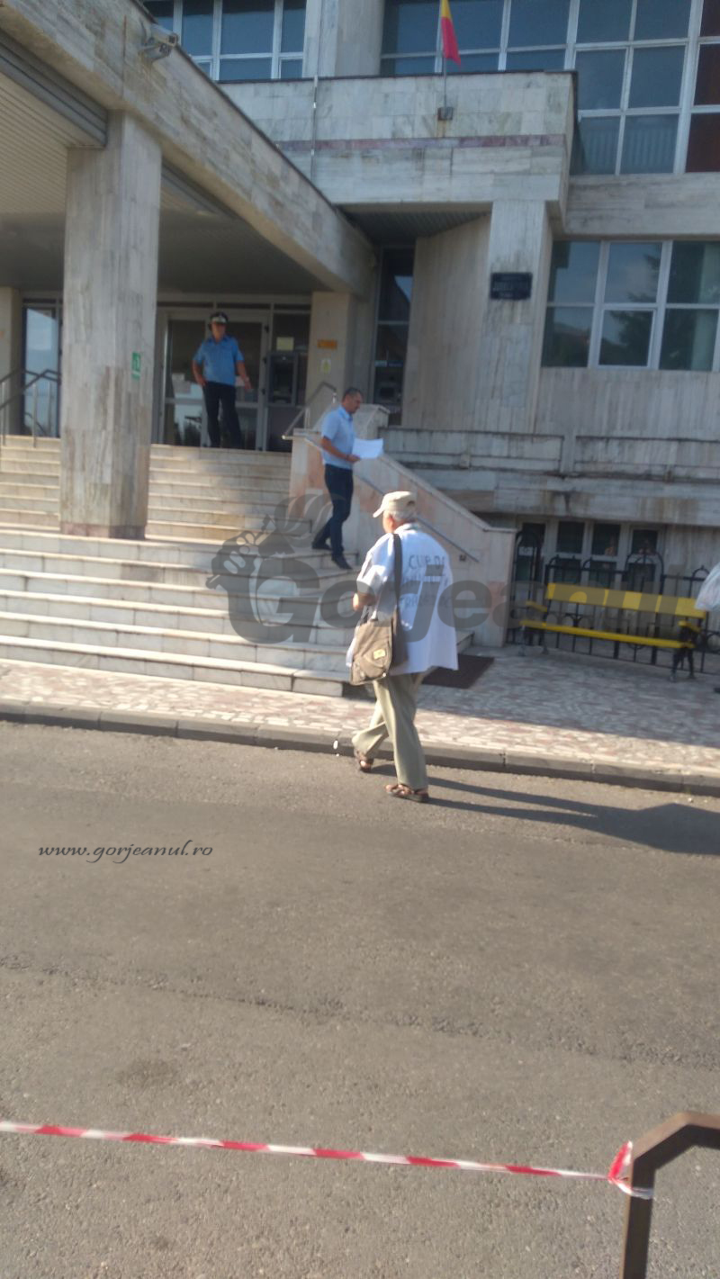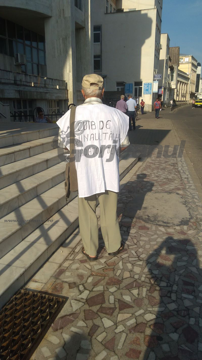 ,,Cuib de criminali, tâlhari, trădători de neam” și ,,M..E magistrați corupți, depravați”! sunt mesajele scrise pe o vestă albă purtată de un septuagenar din comuna Bâlteni, care a inițiat un protest spontan, miercuri, în fața Palatului Justiției din Târgu-Jiu. Pensionarul susține că protestează, deoarece justiția nu e dreaptă, acesta judecându-se timp de 18 ani la instanțele din Gorj și Dolj, fără succes, pentru a anula un titlu de proprietate. Localnicul din satul Moi, comuna Bâlteni, susține că atât el, cât și alte nouă familii sunt afectați de acest act dat cu stânga de autoritățile locale, un drum de servitute fiind îngrădit de deținătorul drepturilor pe acest titlu eliberat în anul 1999.