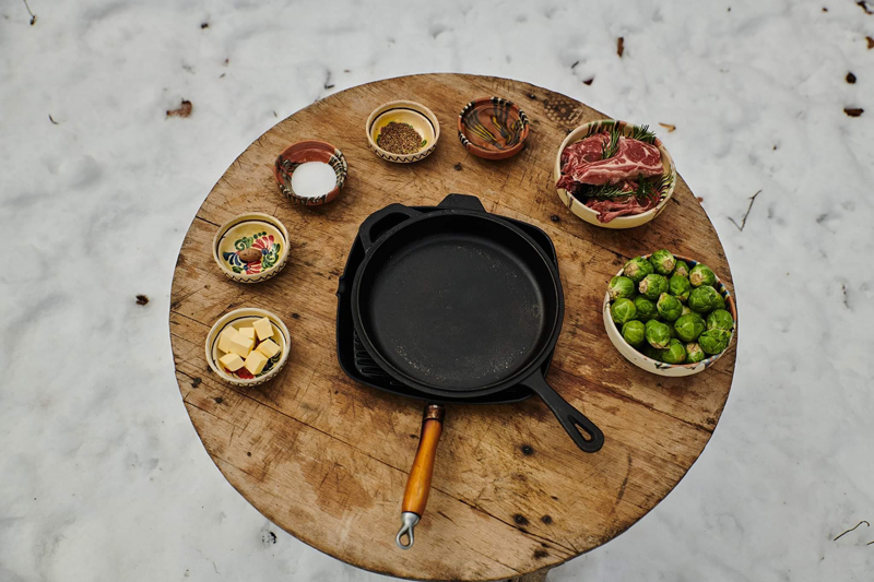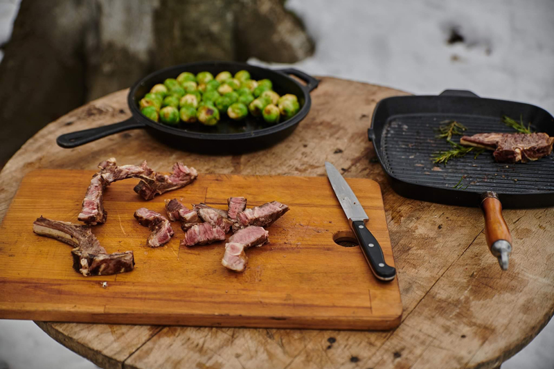 Pentru această rețetă avem nevoie de două tigăi de fontă diferite. Pentru prăjirea cotletelor, eu am folosit o tigaie tip gril iar pentru prăjirea verzei o tigaie normală.
