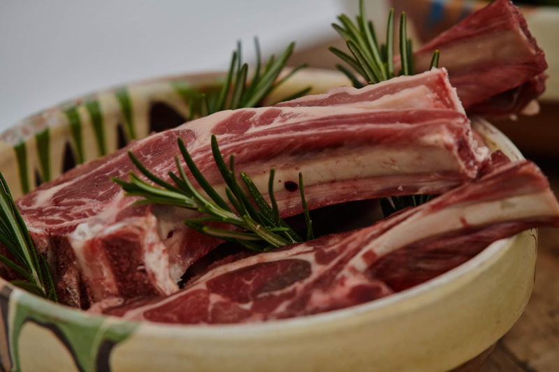 Este o rețetă simplă pentru o masă liniștită în mijlocul naturii. Într-un castron adăugăm cotletele de oaie, aranjăm crenguțele de rozmarin printre cotlete.