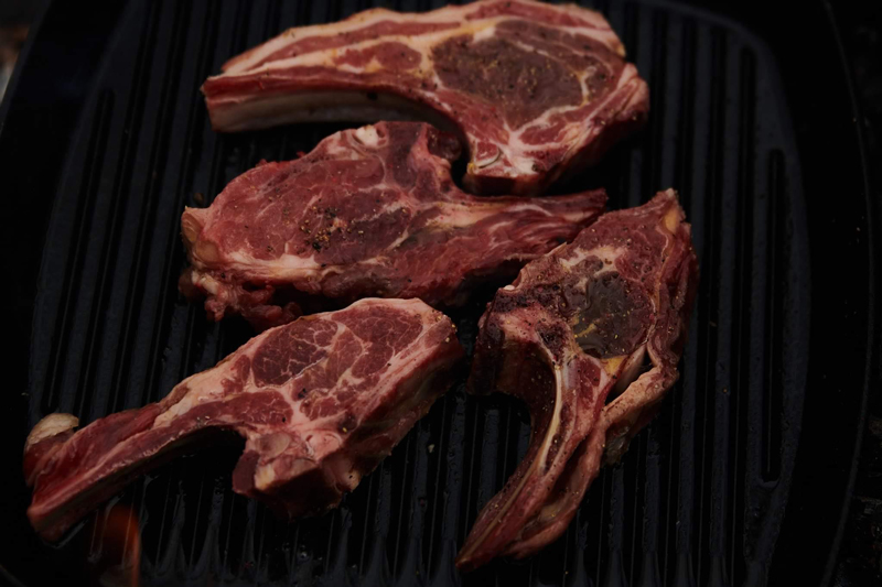 Pentru că deja am marinat cotletele în ulei de măsline, nu mai avem nevoie de ulei pentru prăjire. Recomandarea mea este să adăugăm puțin unt și, altfel, nu se arde uleiul de măsline pentru că nu este un punct de ardere ridicat. Așadar, prăjim cotletele 2 minute, pe fiecare parte, adăugăm crenguțele de rozmarin și le dăm deoparte la temperatura indirectă. Carnea trebuie să fie roze la final. După aceea, le lăsam 15 minute la temperatura indirectă. Temperatura indirectă înseamnă, în natură, tigaia lăsată lângă foc. În cazul de față, sunt suficiente 15 minute pentru cotlete.