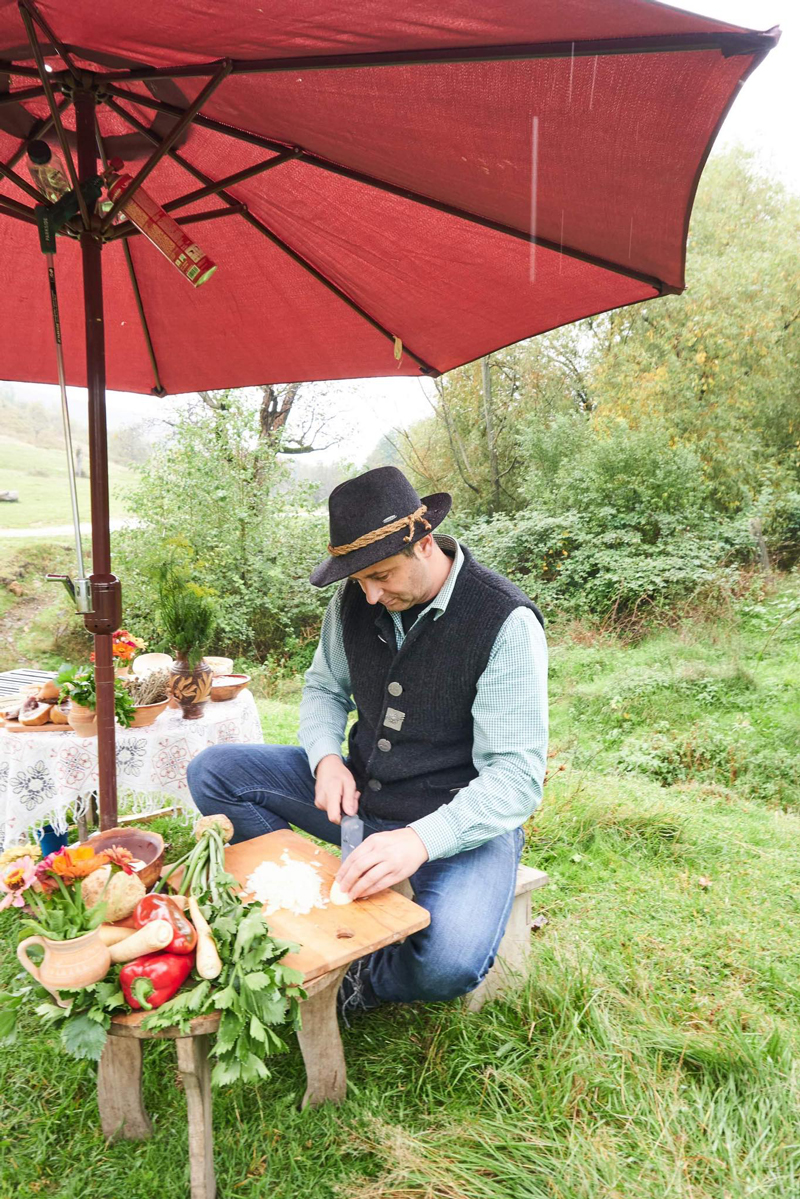 Am făcut focul, am pus o oală de fontă pe foc în care am turnat apă. Am tăiat ciolanul în bucăți de 3-4 cm.