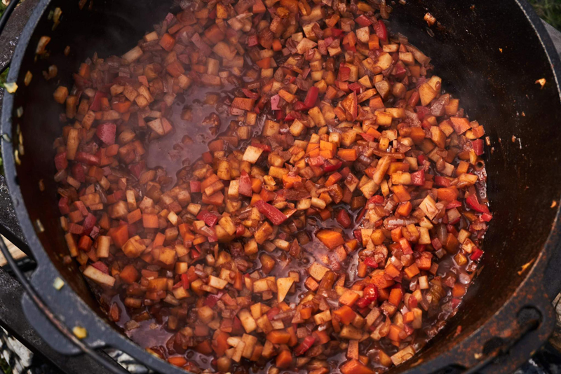 Între timp, am curățat toate legumele pe care le-am tocat în cubulețe mici. Am pus ceaunul din fontă pe foc, am adăugat uleiul în ceaun.
