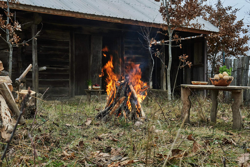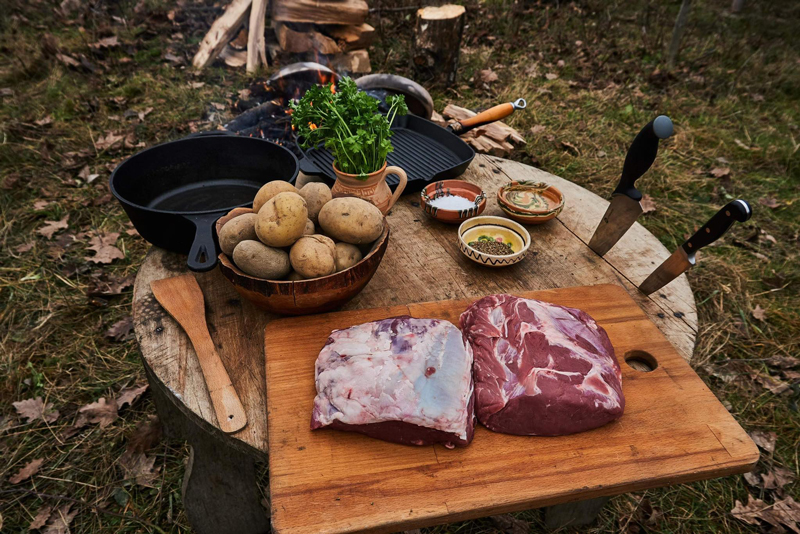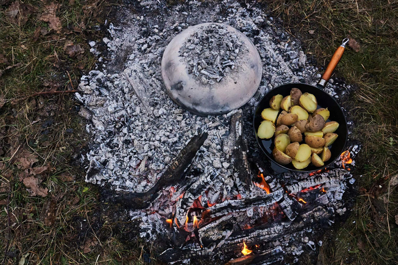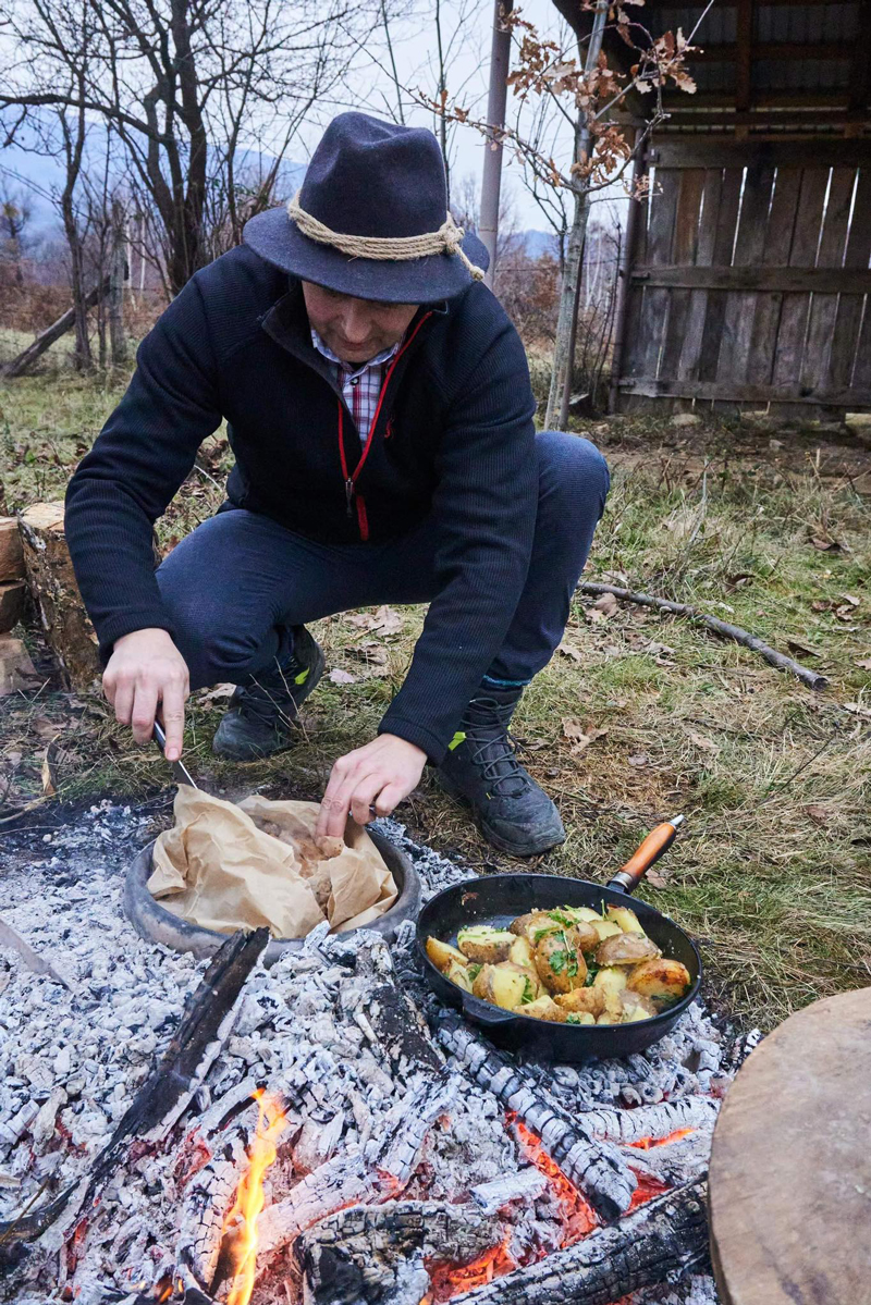 Dăm focul la o parte, adăugăm capacul peste țest, așezăm țestul peste vatră. Peste capac adăugăm jar și facem focul și, între timp, mai ridicăm capul să veri ficăm. În funcție de calitatea cărnii, acest mod de gătire necesită aproximativ 3 ore. Pregătim cartofii lângă foc. De exemplu, eu am folosit cartofi a căror coajă poate fi mâncată. Îmi plac foarte mult pentru că au un gust deosebit. Prima dată, spălăm bine cartofii, apoi îi fierbem într-o cratiță de fontă, după care îi lăsăm la răcit.