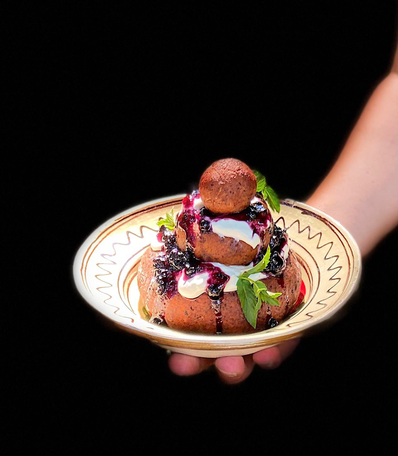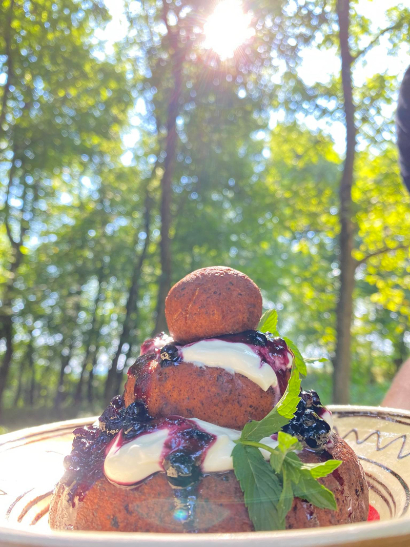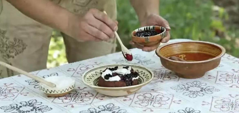 Adăugăm, între fiecare bucată, smântână și dulceață iar, la final, presărăm zahăr pudră. Zahărul pudră este opțional. Adăugăm pentru decorare câteva crenguțe de mentă.