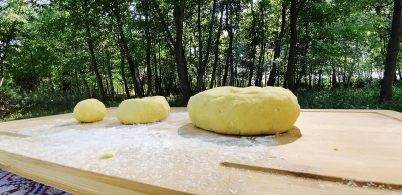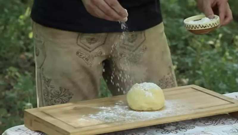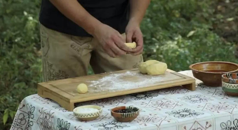 Împărțim aluatul în diferite bile, eu am făcut bile mari și mici. Pe un tocător, presărăm puțină făină și modelăm papanașii.