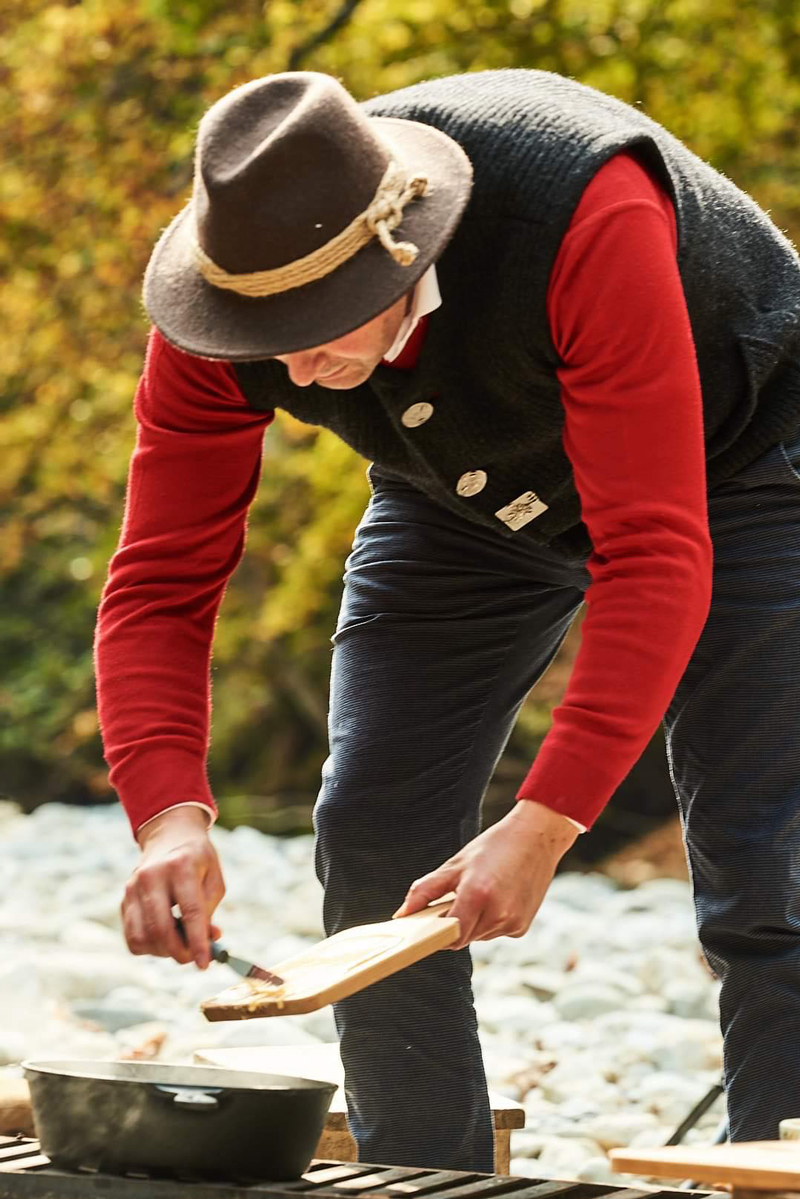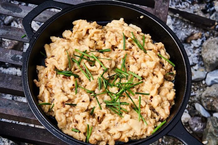 Într-o tigaie adăugăm untul și, atunci când a început să sfârăie, adăugăm tăiețeii și îi prăjim de culoarea aurie, adăugăm ceapa, amestecăm, apoi sare, piper și nucșoară după gust, radem cașcavalul. Amestecăm totul bine până când cașcavalul s-a topit. Ornamentăm cu fire de Arbagic verde și-l servim cât este cald. Nu uitați să gătiți pe foc pentru că mâncarea are alt gust, mai ales în tigăile de fontă, arse de timp și dor!