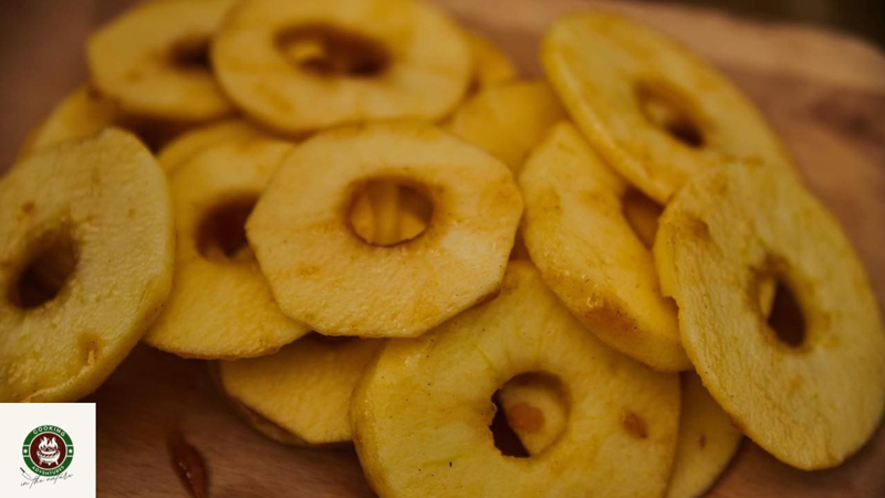 Curățăm merele de coajă, scoatem miezul si le tăiem rondele de aproximativ 1 cm grosime și le presărăm cu zeamă de lămâie.
