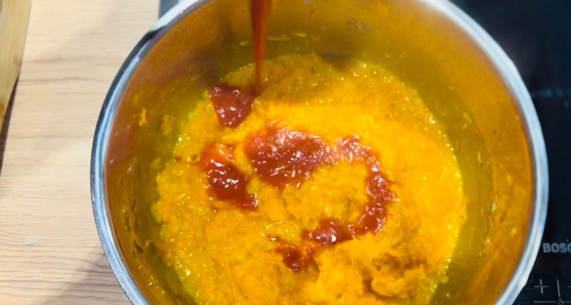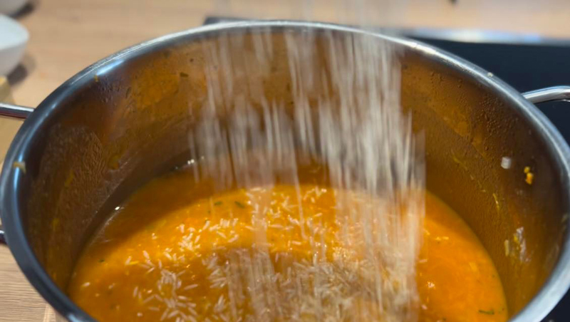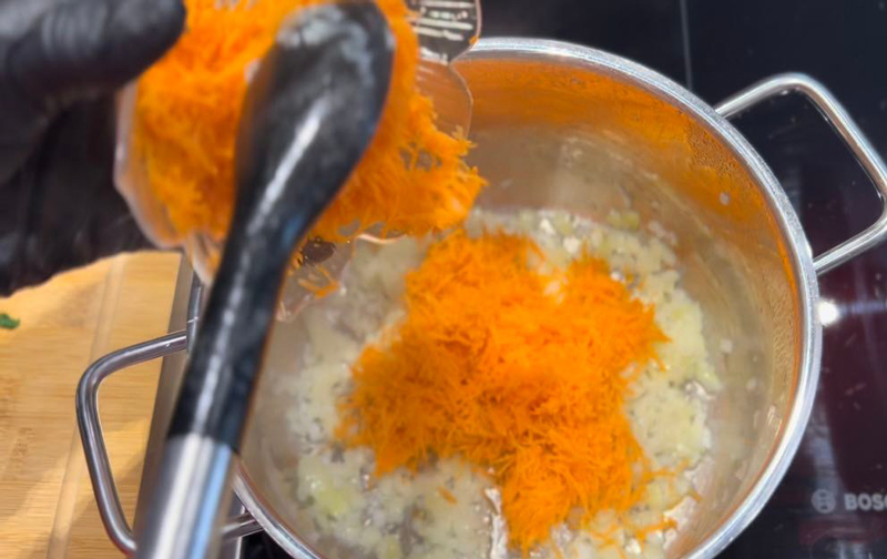 Atingem ceapa și morcovul cu puțină supă clară de legume și lăsăm să se reducă. Adăugăm
