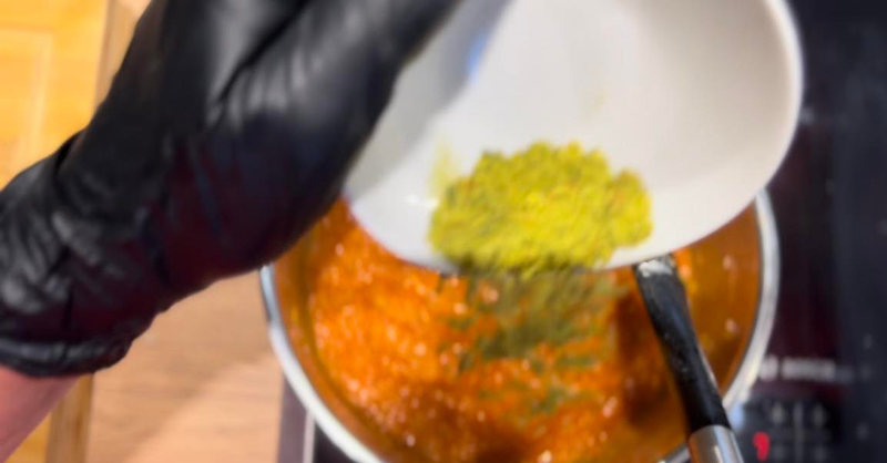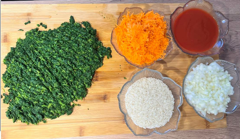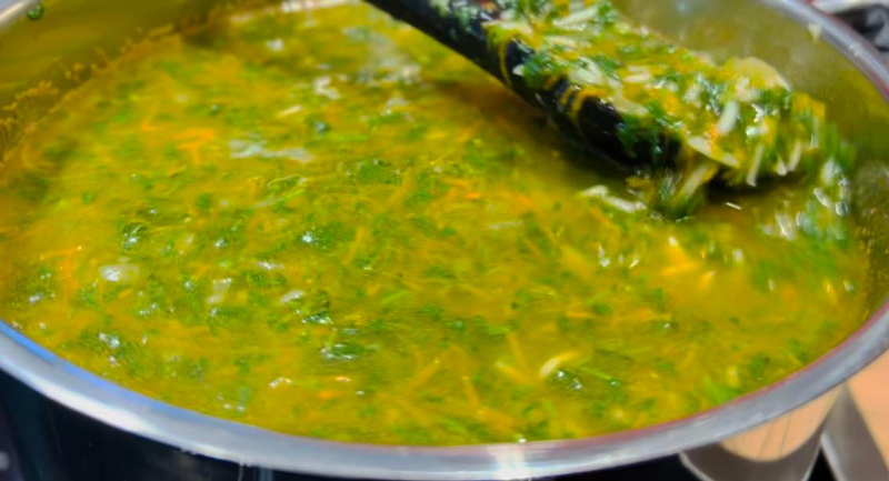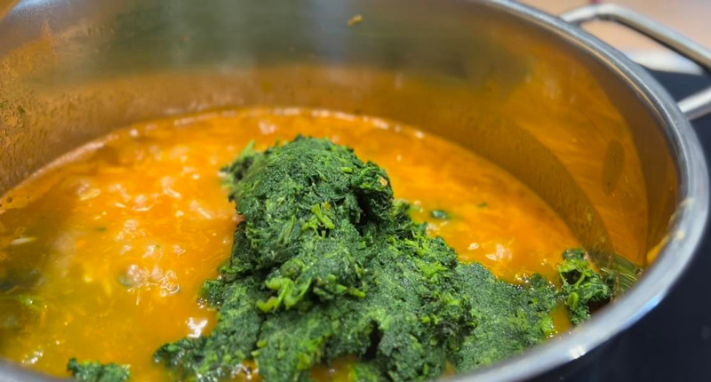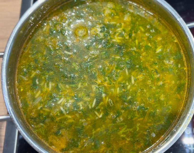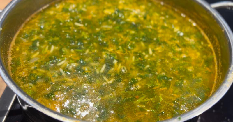 sosul de roșii, două lingurițe de vegeta, eu am folosit vegeta naturală fără conservanți, amestecăm, după care adăugăm restul de supă clară de legume, orezul, urzicile tocate mărunt.